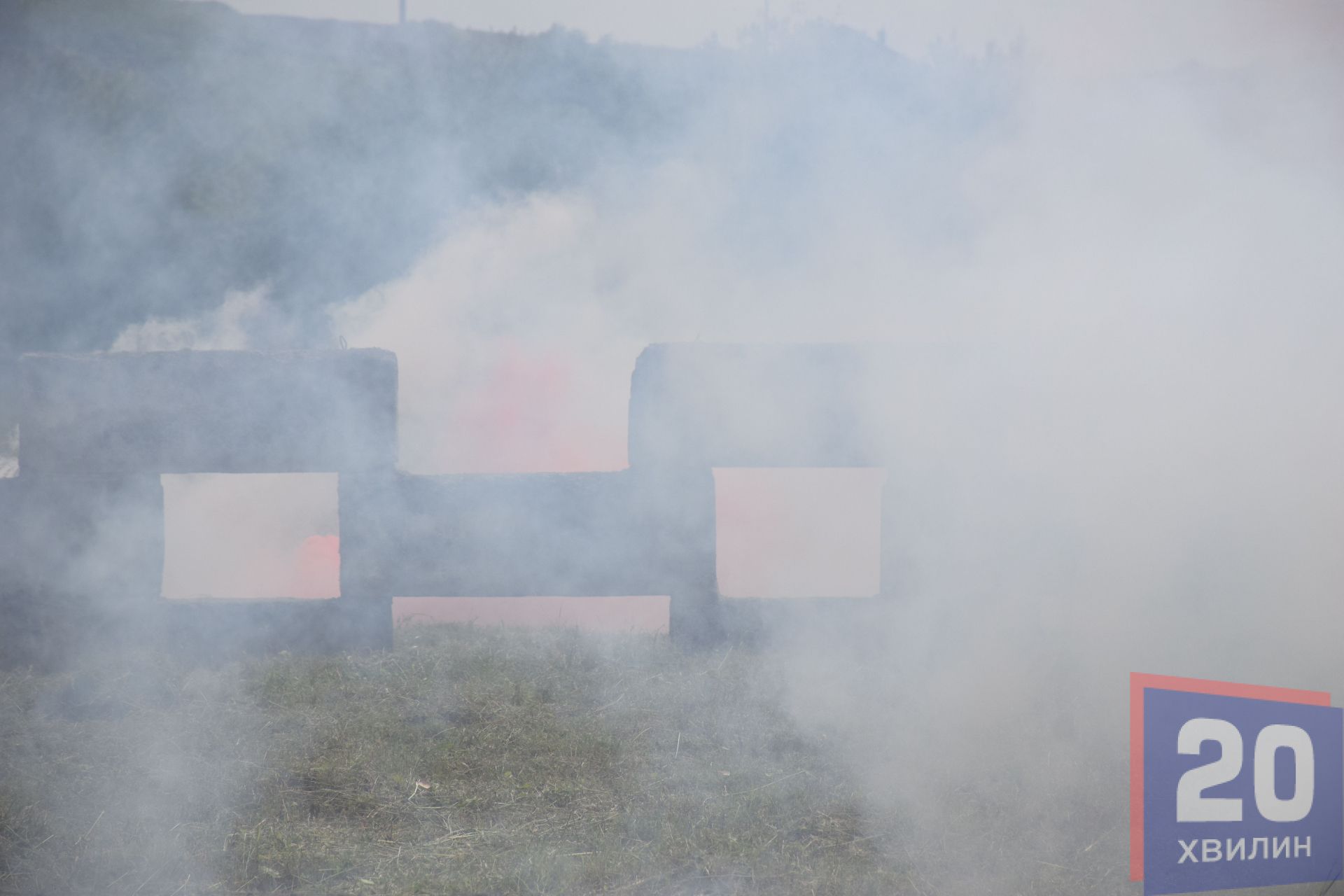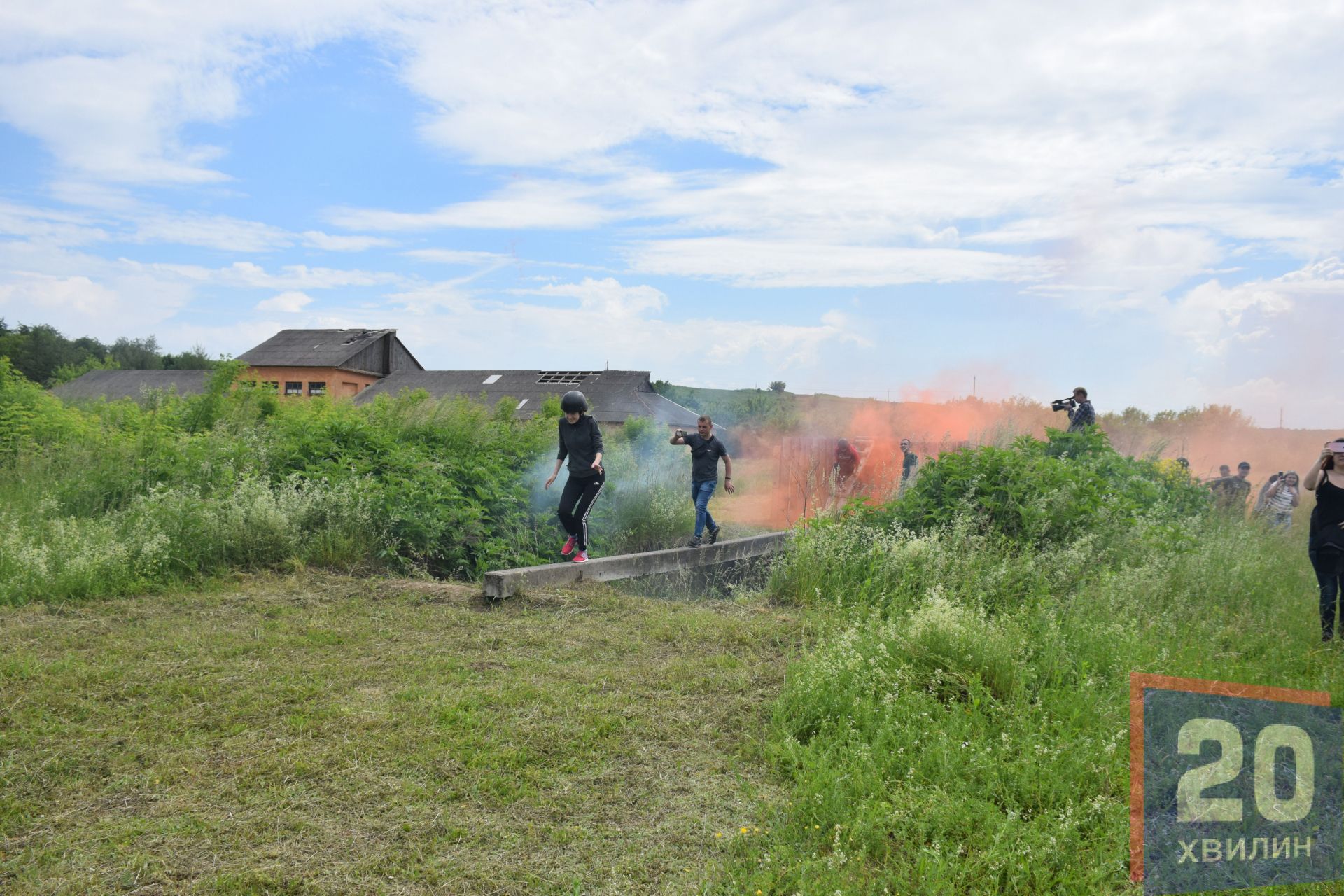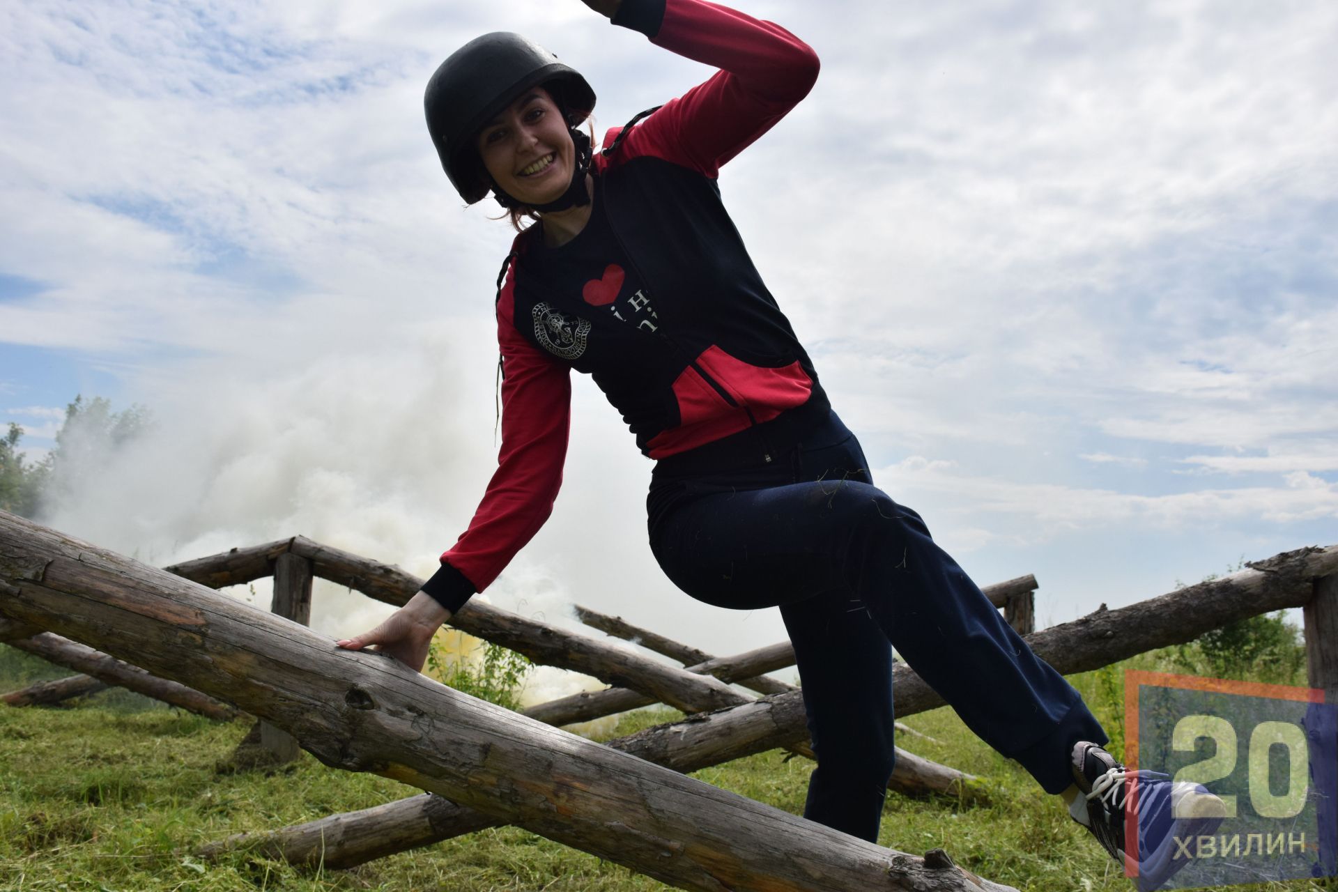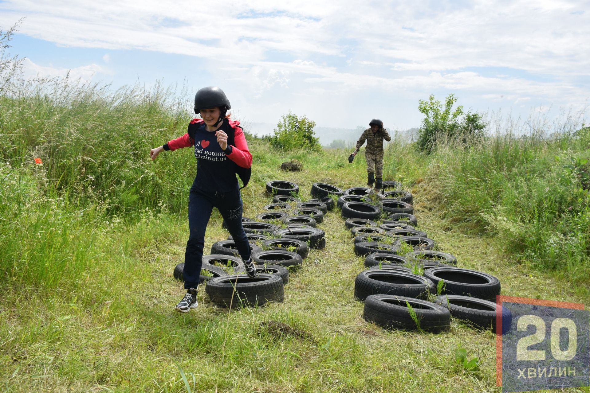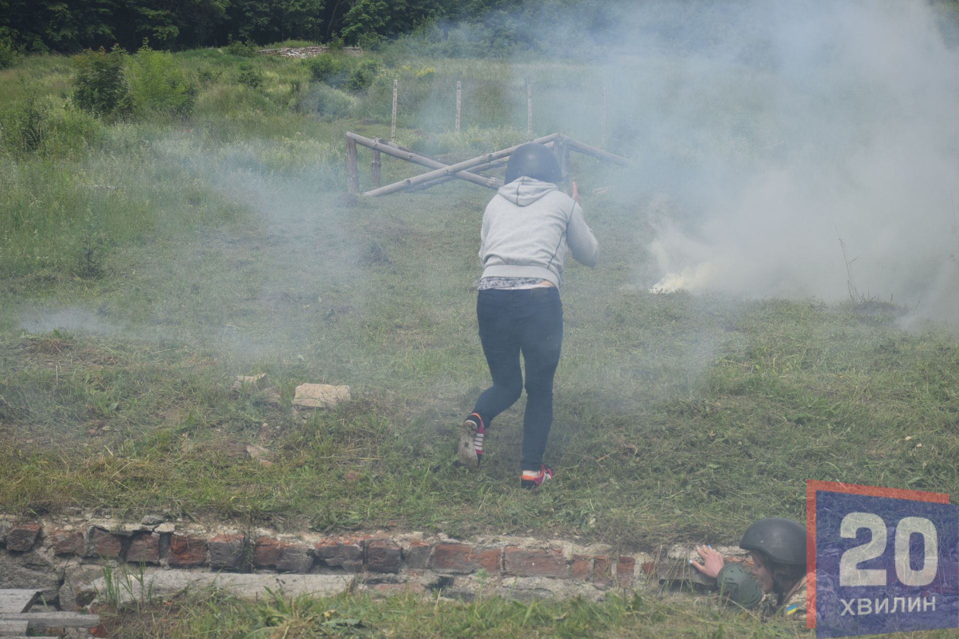 Вдягаємо спортивні кофти, на голову каски, її вага – майже кілограм. Та, нелегко буде так бігти, добре, що хоч «броніки» на дівчат не вдягнули. На щастя, розпогодилось, сонячно, але дуже пече. Рушаємо, трійка відважних – на старт. Забігаю по похилій драбині, серце стукає, бах, під ногами – стовпи жовтого диму, пробую максимально швидко спуститися донизу. Розумію – вибухи не справжні, але звук дуже потужний, спрацьовує інстинкт самозахисту.