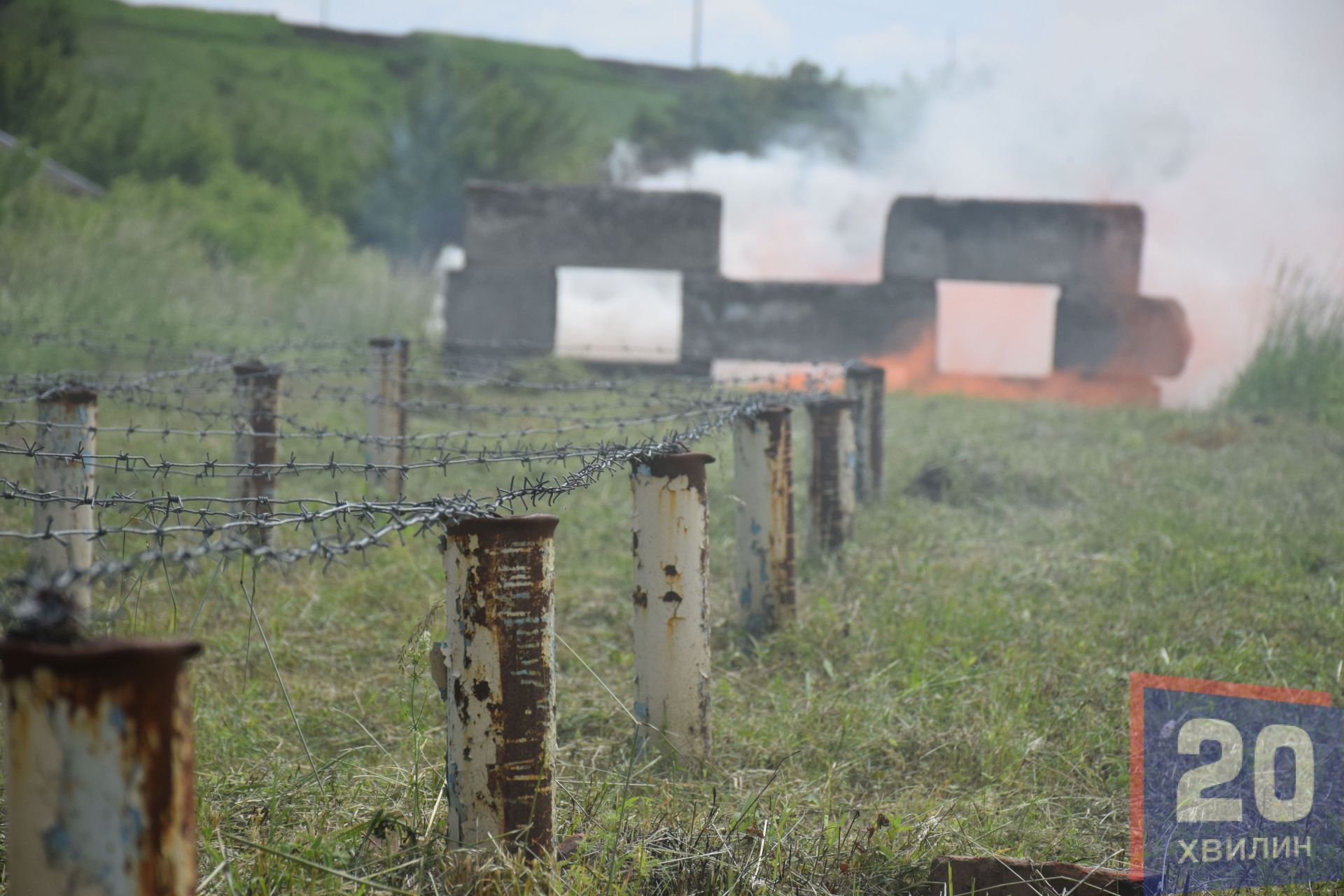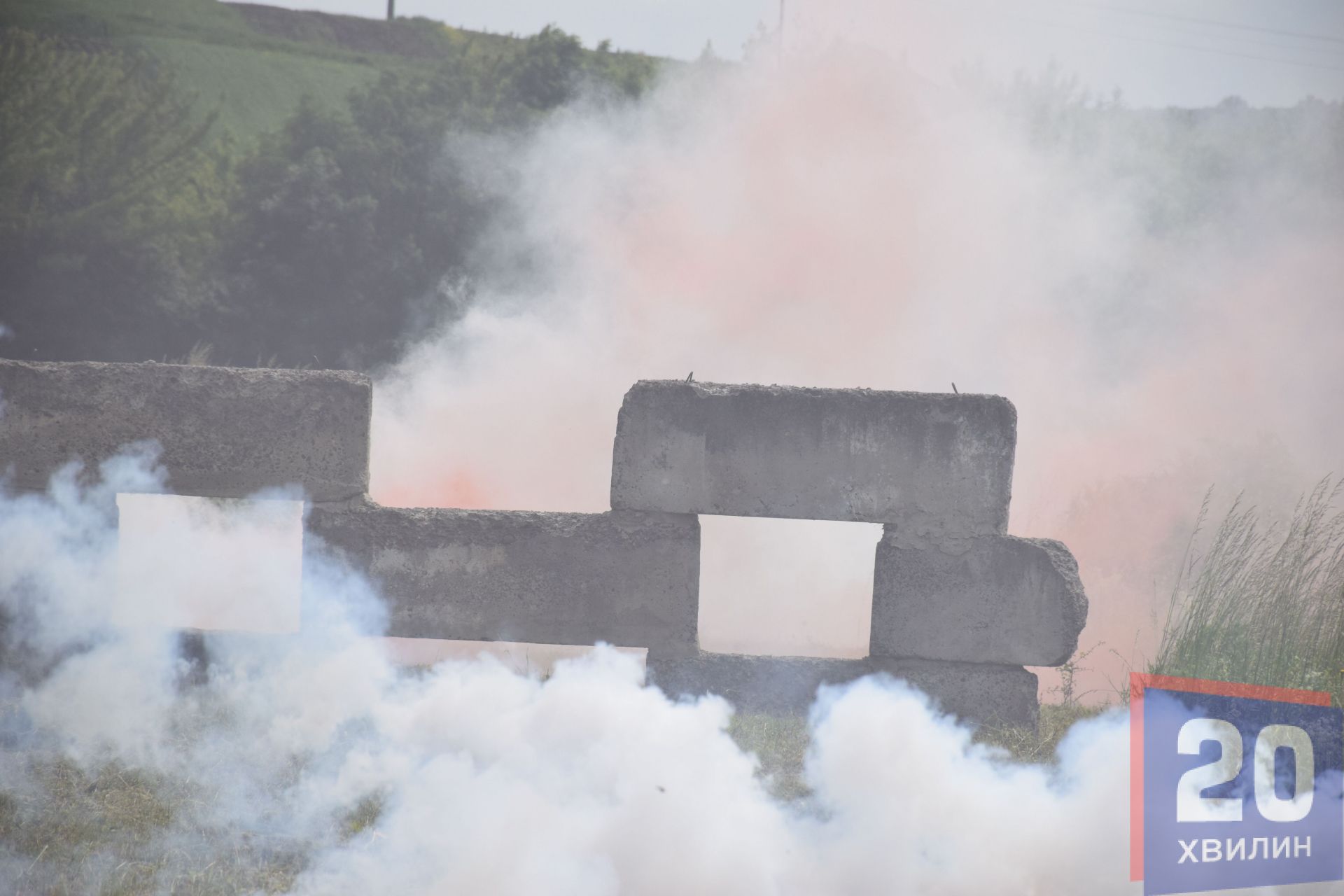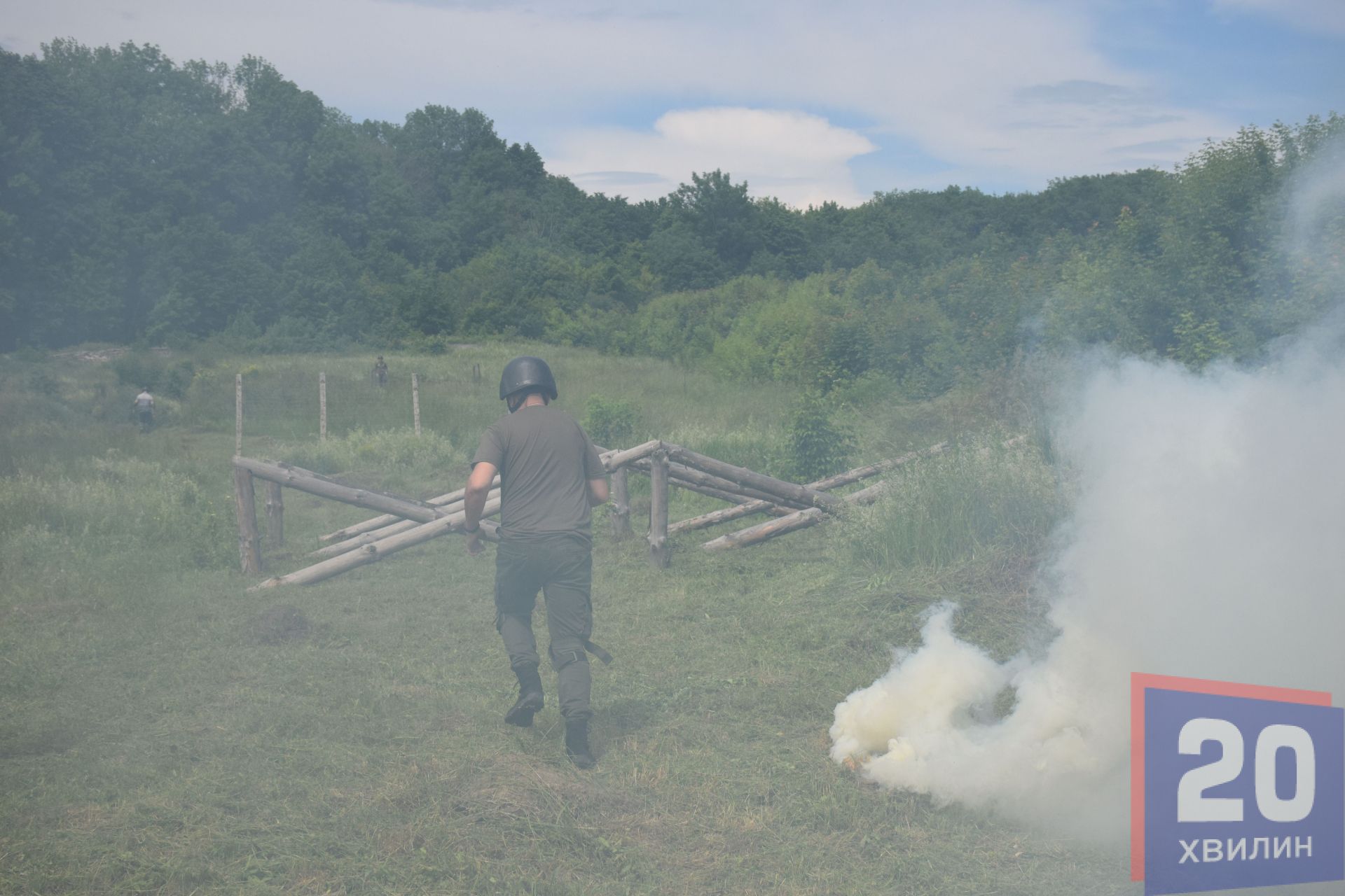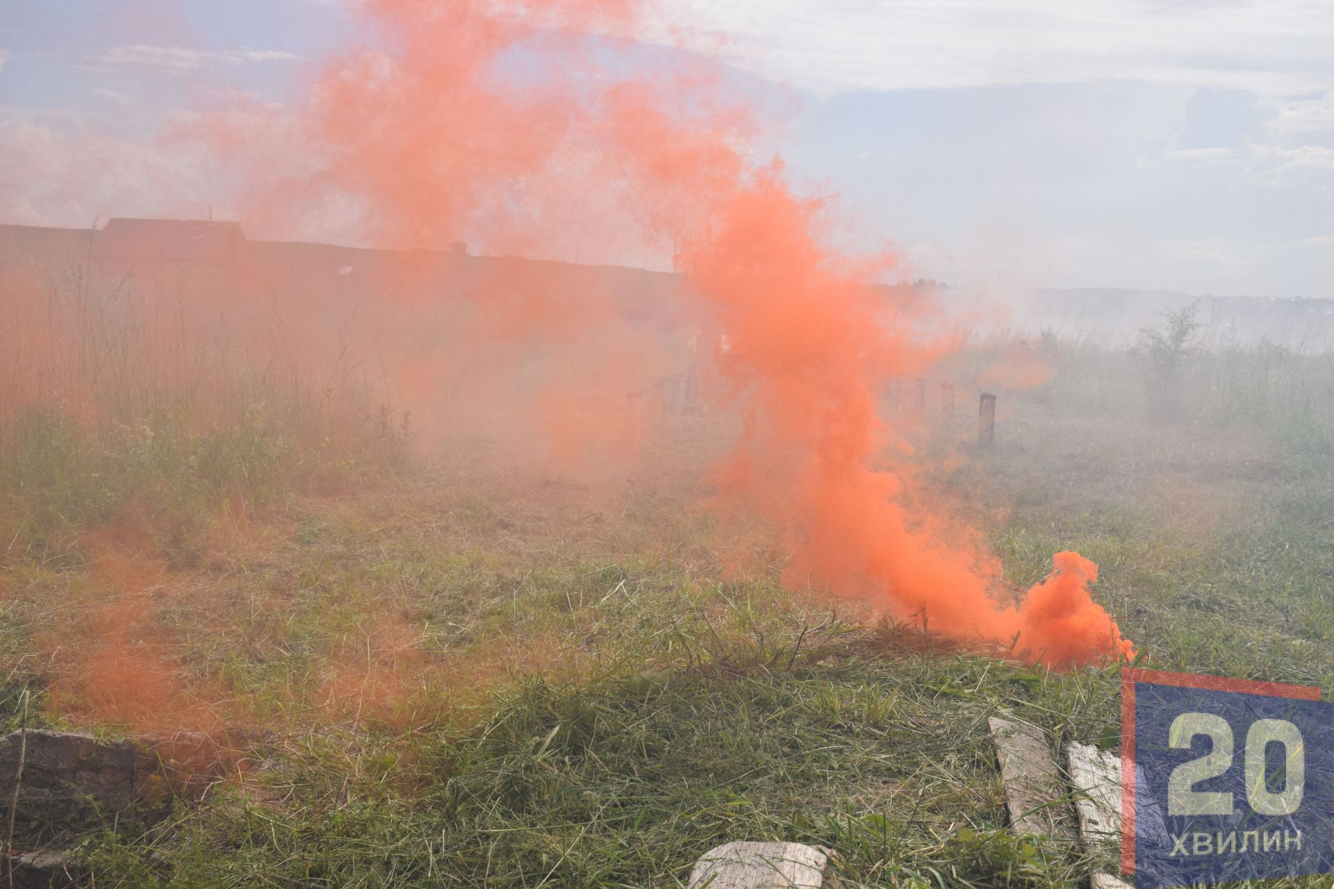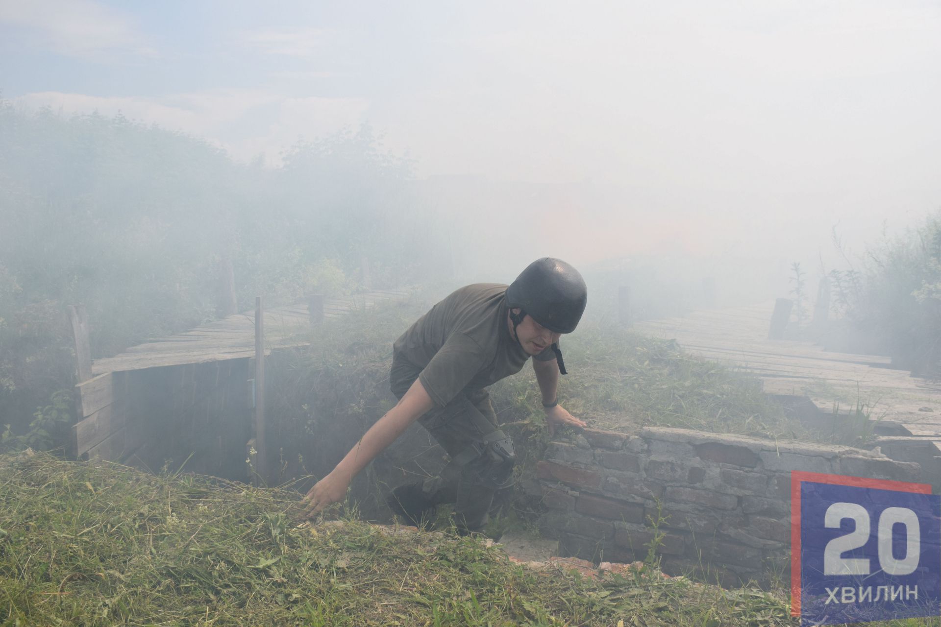 Вдягаємо спортивні кофти, на голову каски, її вага – майже кілограм. Та, нелегко буде так бігти, добре, що хоч «броніки» на дівчат не вдягнули. На щастя, розпогодилось, сонячно, але дуже пече. Рушаємо, трійка відважних – на старт. Забігаю по похилій драбині, серце стукає, бах, під ногами – стовпи жовтого диму, пробую максимально швидко спуститися донизу. Розумію – вибухи не справжні, але звук дуже потужний, спрацьовує інстинкт самозахисту.