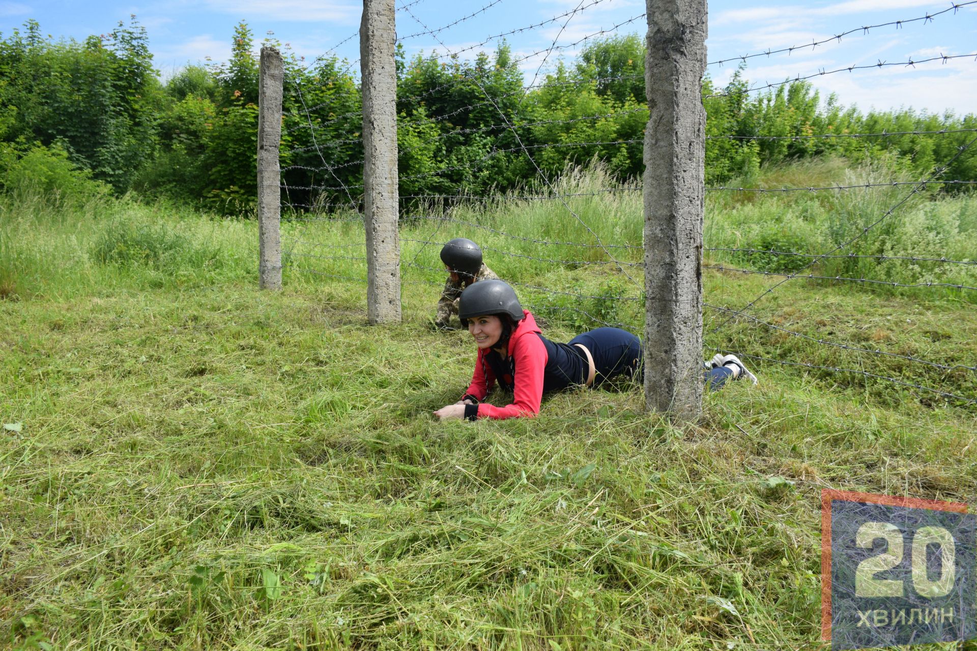 Перебігаючи через балку, головне – не дивитися вниз. Чесно, навіть уявляти не хочу, що буде, коли не втримаєшся. Ніякої страховки, у військових – усе серйозно. Далі траншея, ще трохи – колючка. Чого ж вона так низько?! Збоку щось вибухає, гори диму, падаю на землю і повзу, камені чіпляють одяг, не піднімати голову, не піднімати голову, прокручую подумки, усе, Слава Богу, пролізла. Далі вже як на автоматі, колеги недаром жартували: «Усе робиться з переляку!» Через пару сотень метрів і падати, і повзти по мокрій траві, де купа болота і ящірки вже не так страшно і бридко. Місія виконана! Смугу перешкод пройшли. Таке випробування обов’язково долає кожен солдат в армії.