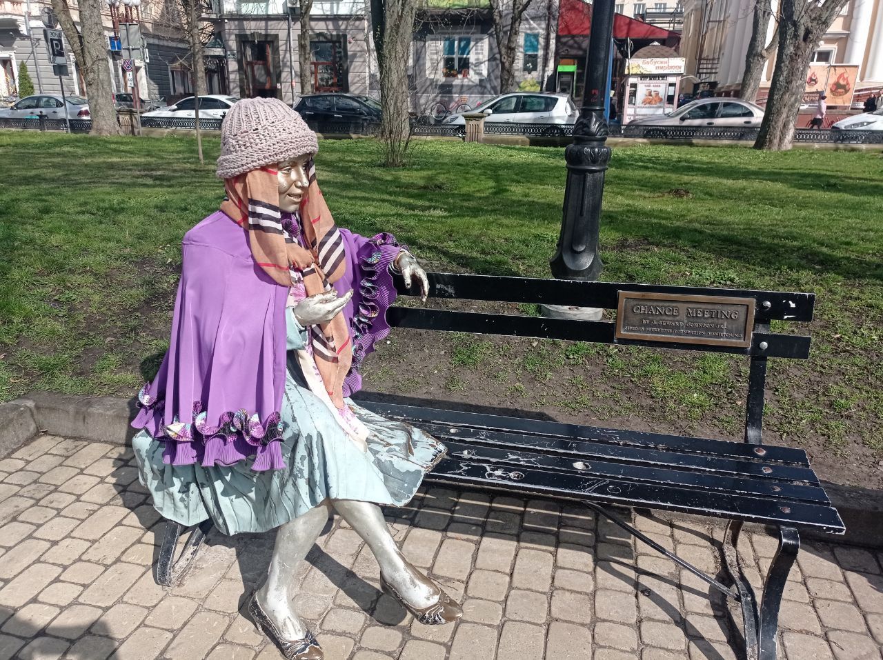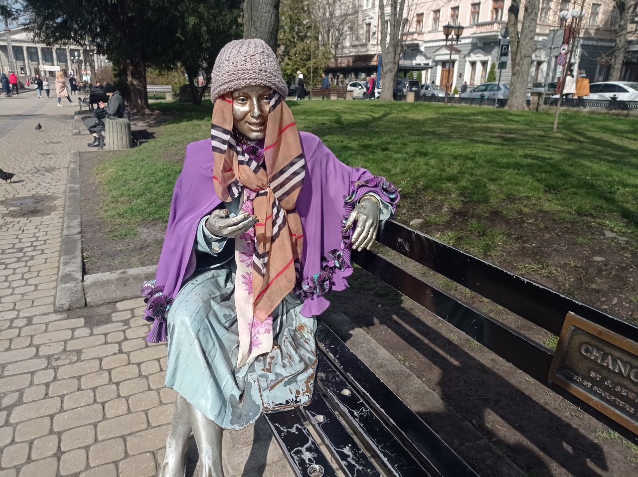 Скульптуру одягнули ще 20 березня. Тоді «залізну леді» на лавці прикрасили накидкою, шапкою та окулярами.
