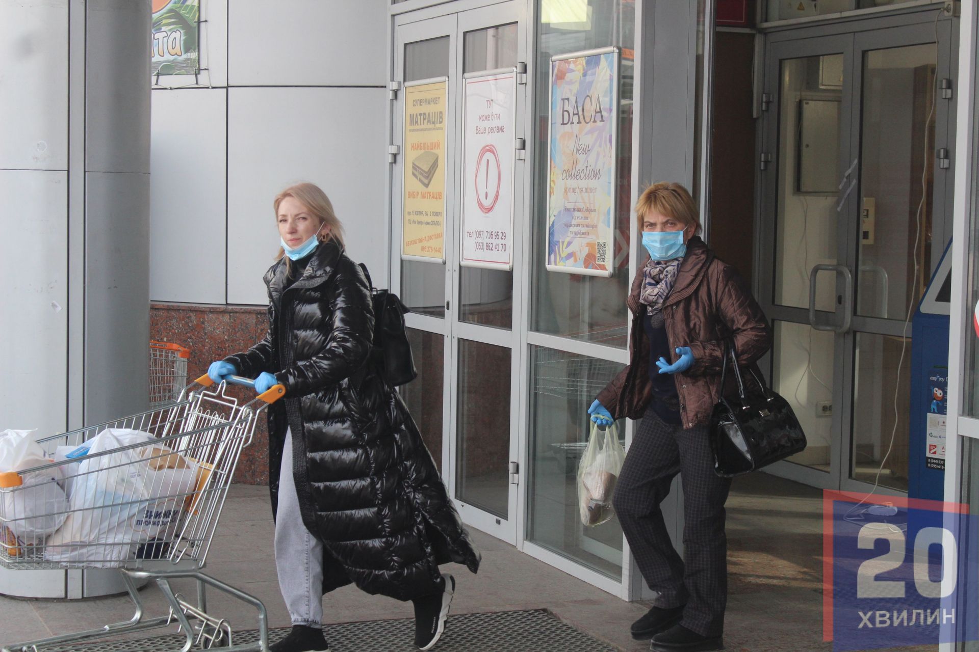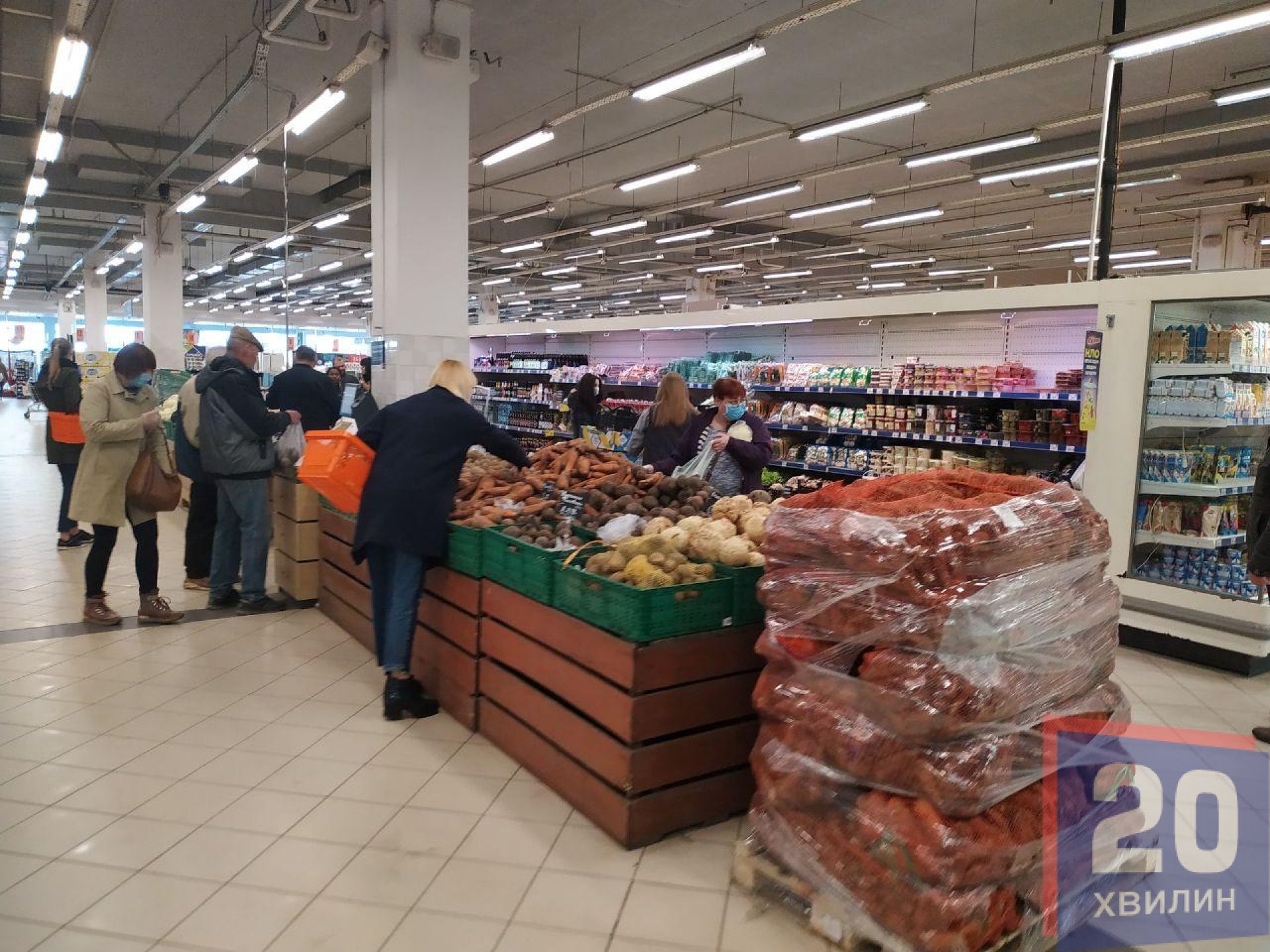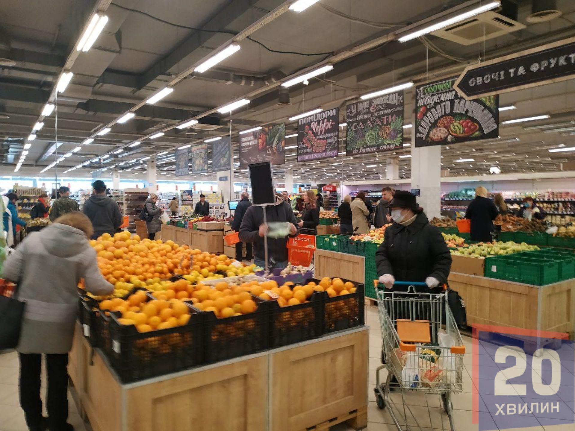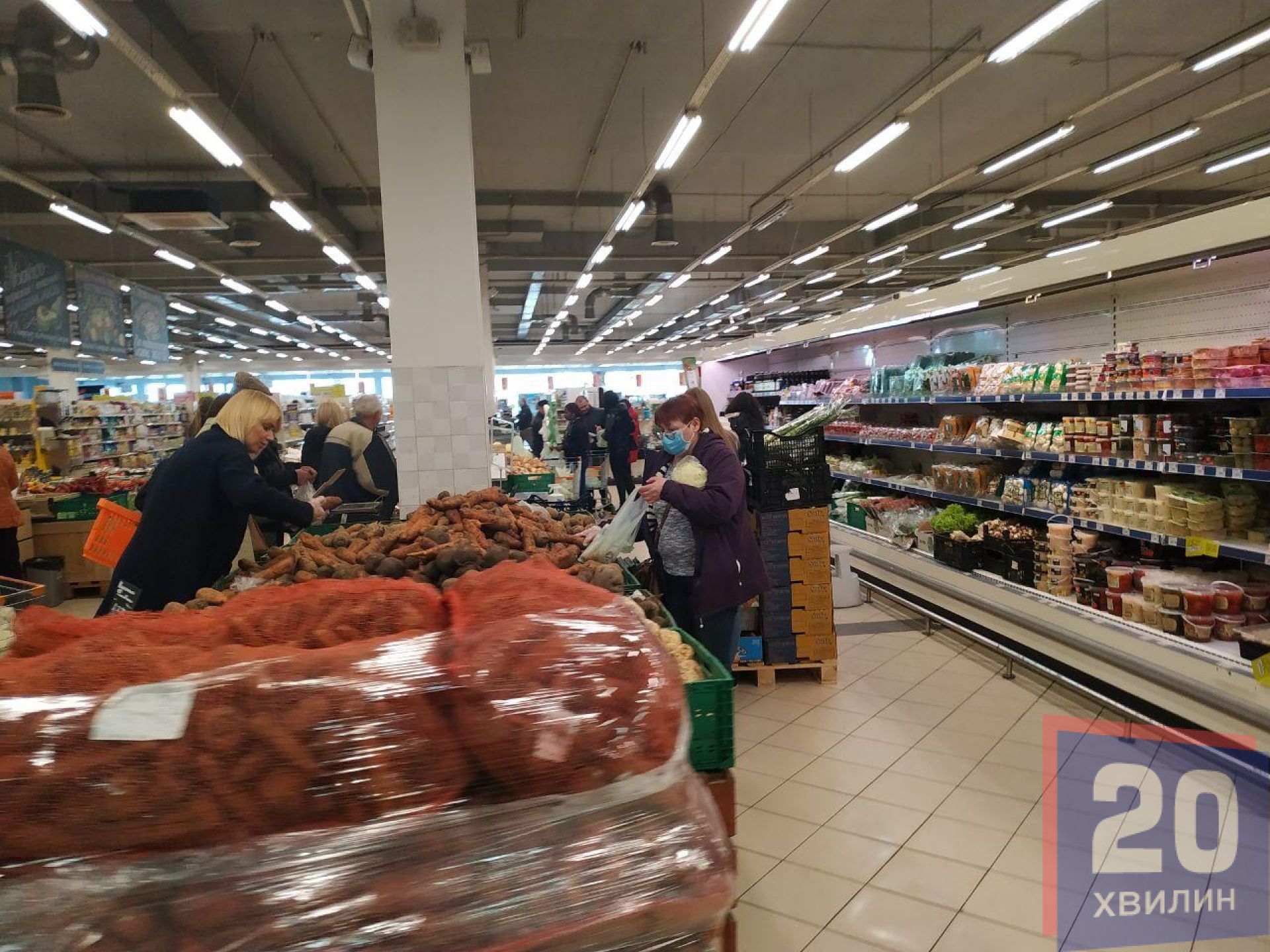Найбільше людей в масках у супермаркетах. Там чи не кожен другий покупець одягнув маску. Наплив людей великий, переважно у відділі з овочами та фруктами. Біля круп людей вже значно менше, однак не через те, що їх перестали скуповувати, а через те, що їх розкупили – стелажі пусті. Те, що лишилося – продавці розфасували по пакетах. Відкритого товару немає. У супермаркетах хлібобулочні вироби пакують у поліетиленову плівку, печиво – у одноразову тару.