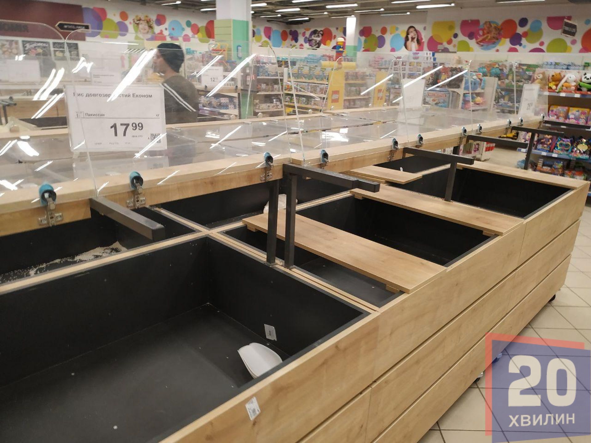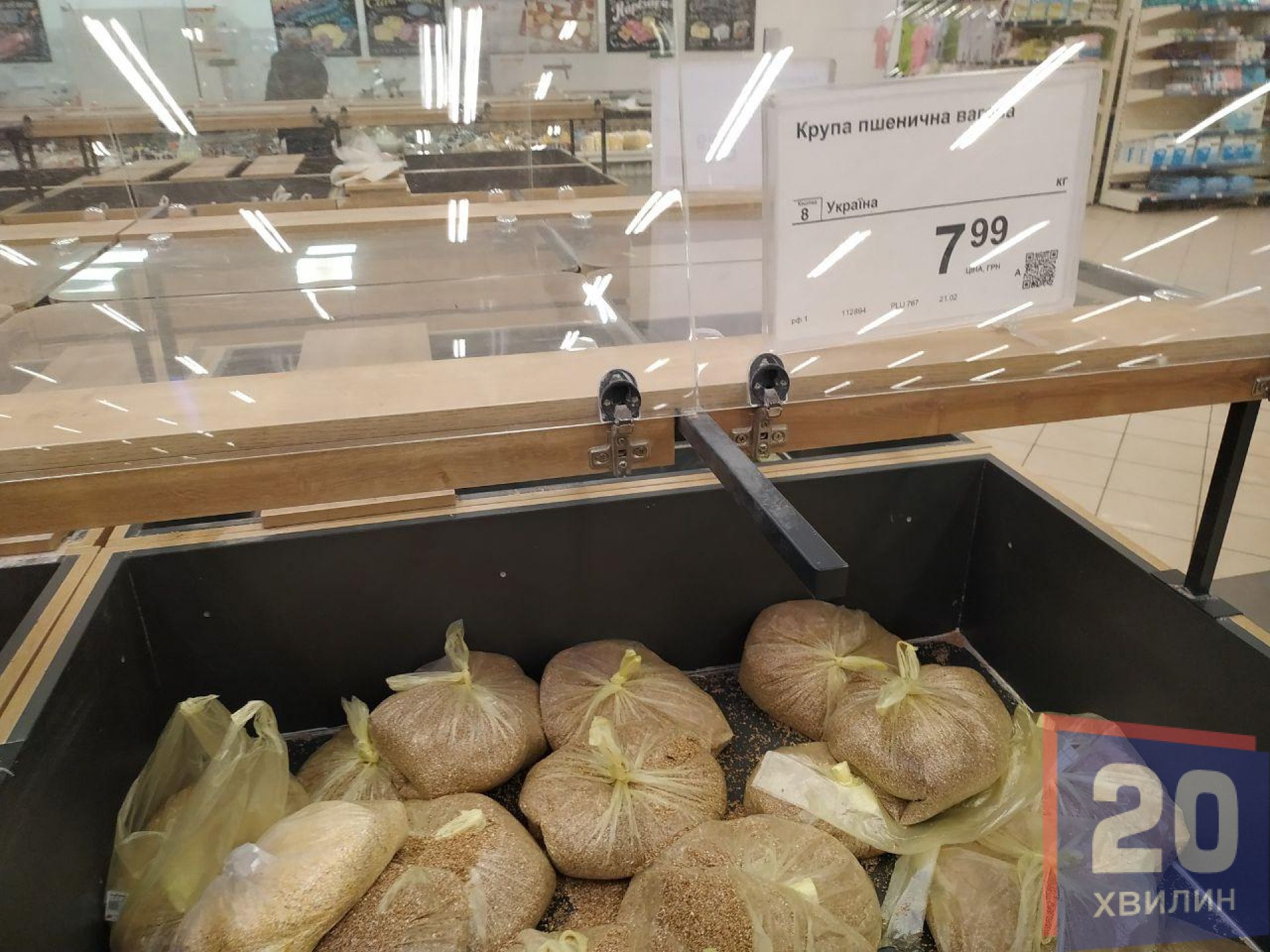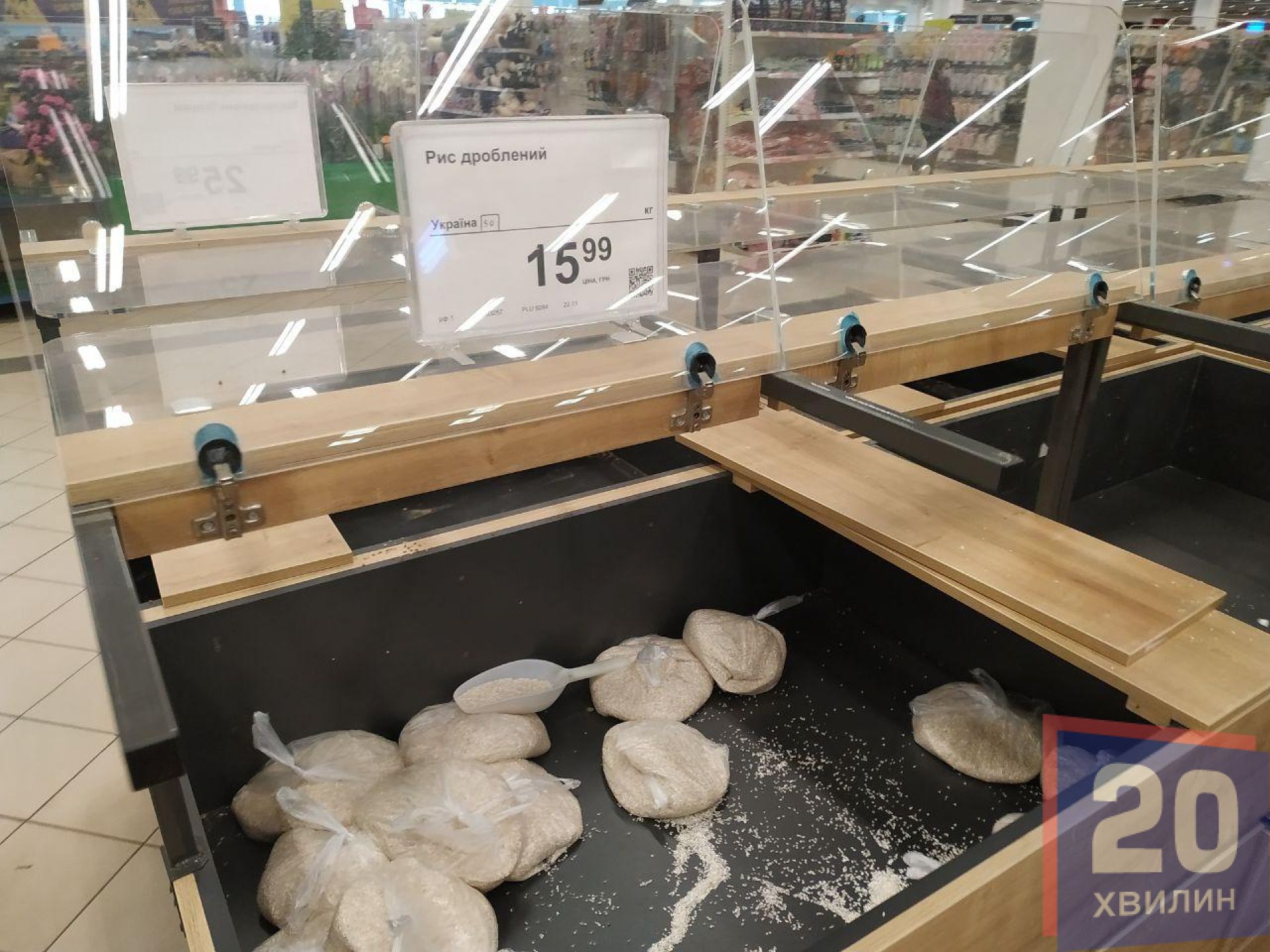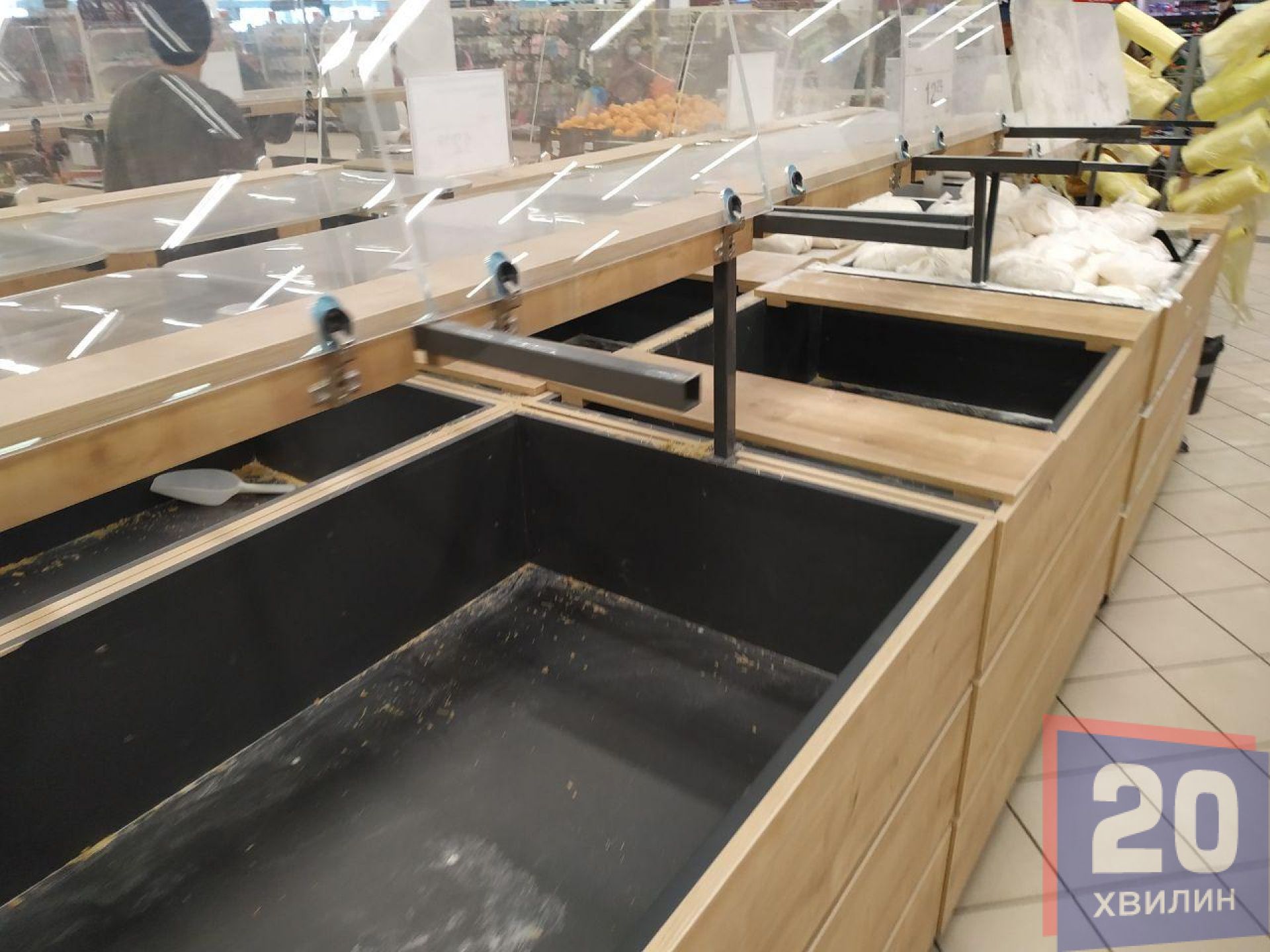 Найбільше людей в масках у супермаркетах. Там чи не кожен другий покупець одягнув маску. Наплив людей великий, переважно у відділі з овочами та фруктами. Біля круп людей вже значно менше, однак не через те, що їх перестали скуповувати, а через те, що їх розкупили – стелажі пусті. Те, що лишилося – продавці розфасували по пакетах. Відкритого товару немає. У супермаркетах хлібобулочні вироби пакують у поліетиленову плівку, печиво – у одноразову тару.