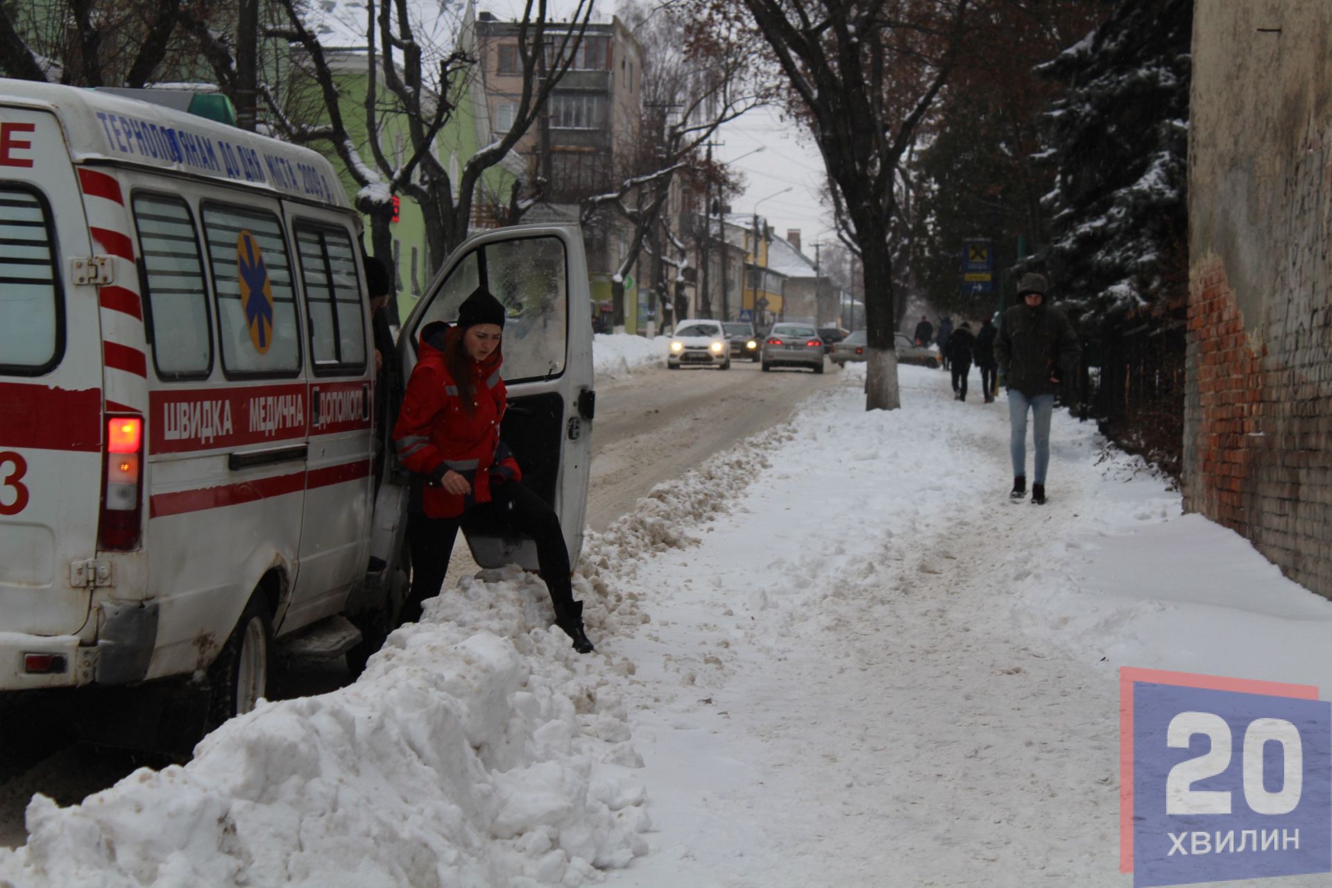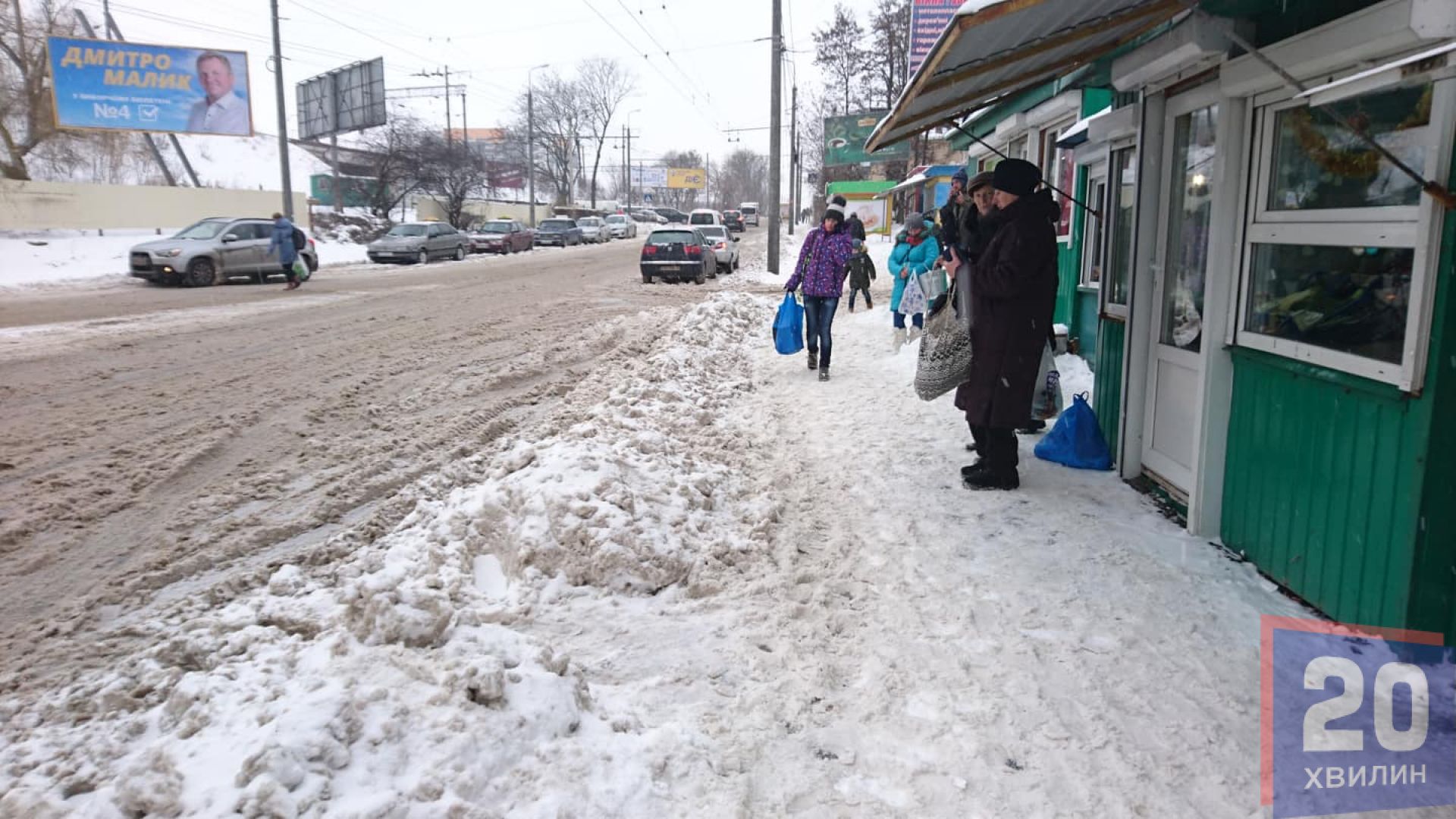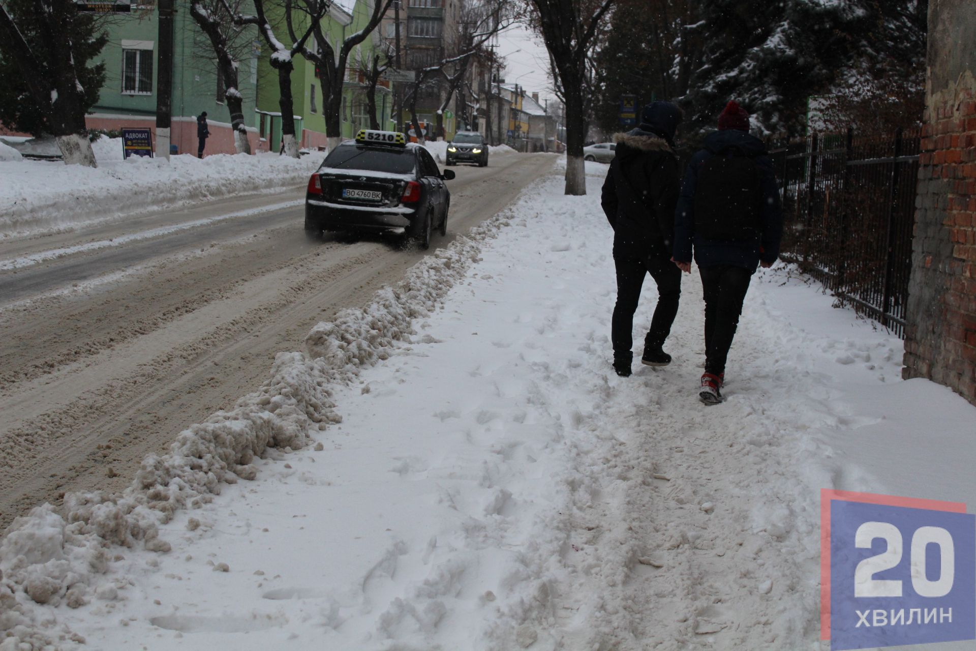Щоб зайти у громадський транспорт чи вийти з нього, вранці 17 грудня тернополянам довелося перестрибувати через кучугури снігу на більшості зупинок. Не розчистили комунальники і багато тротуарів.