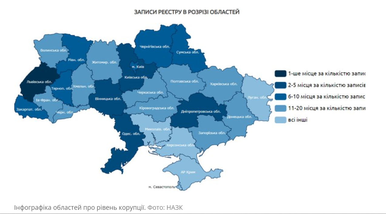 У Національному агенції з питань запобігання корупції створили інфографіку областей на основі кількості записів у Єдиному державному реєстрі осіб, які вчинили корупційні або пов’язані з корупцією правопорушення. Про це йдеться на сторінці Єдиного державного реєстру.