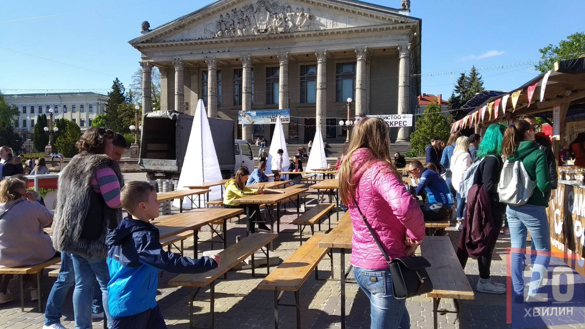 В обід тут розпочали працювати торгові "точки", в яких пожна придбати вуличну їжу. Посеред майдану встановили столики, за якими тернополяни можуть перепочити та поїсти.