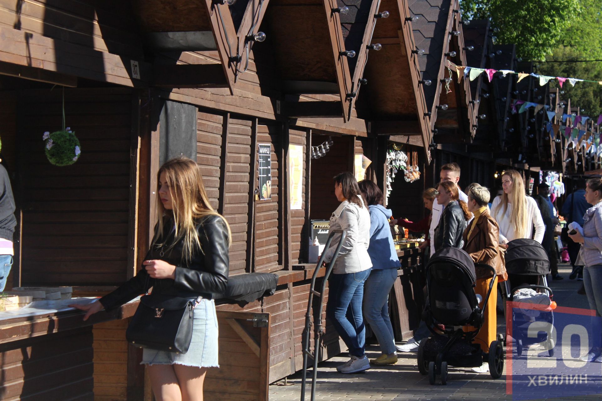 У будиночках, які залишились на майдані ще з зимових свят, можна купити товари власного виробництва та вироби народного мистецтва.