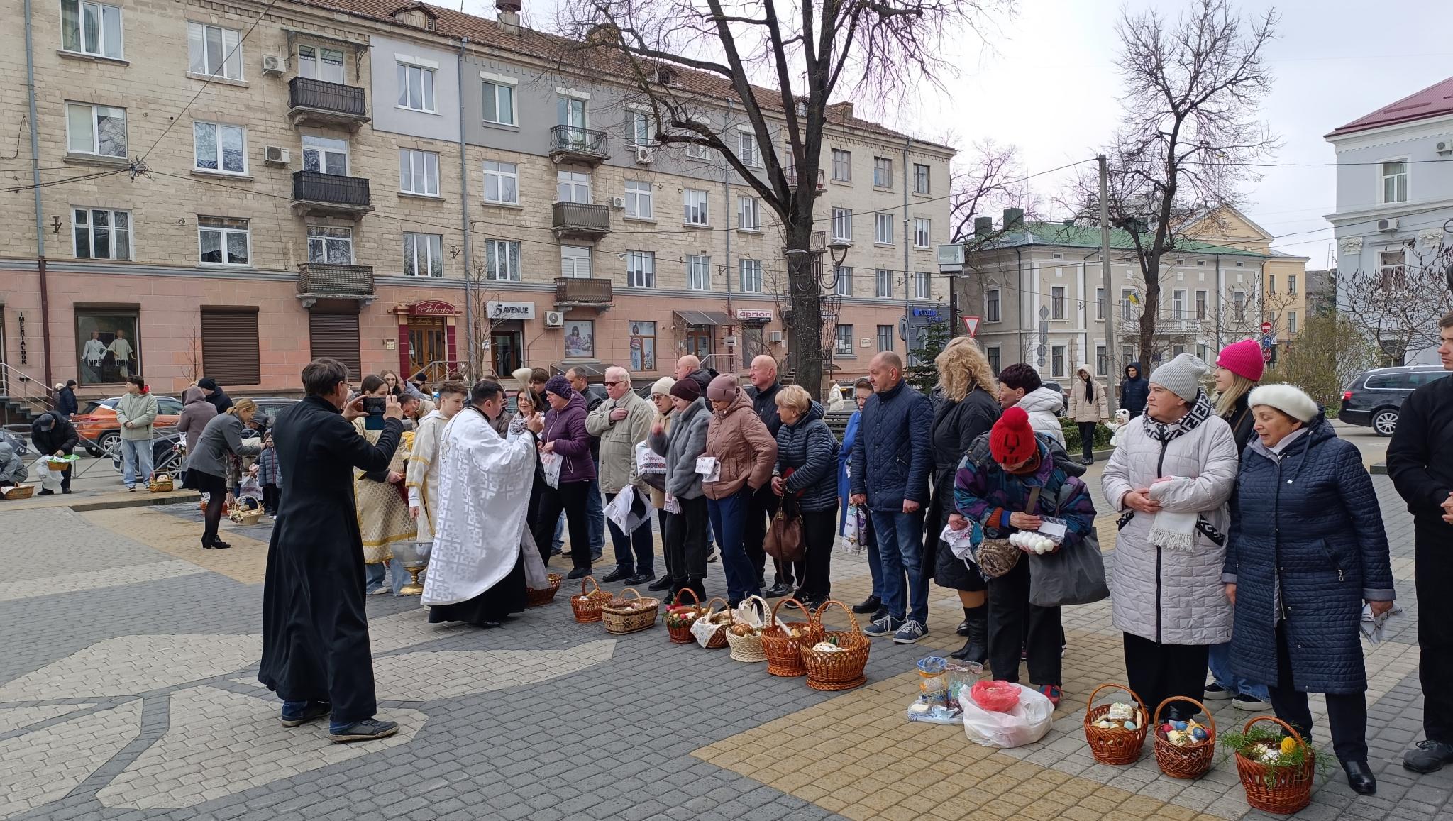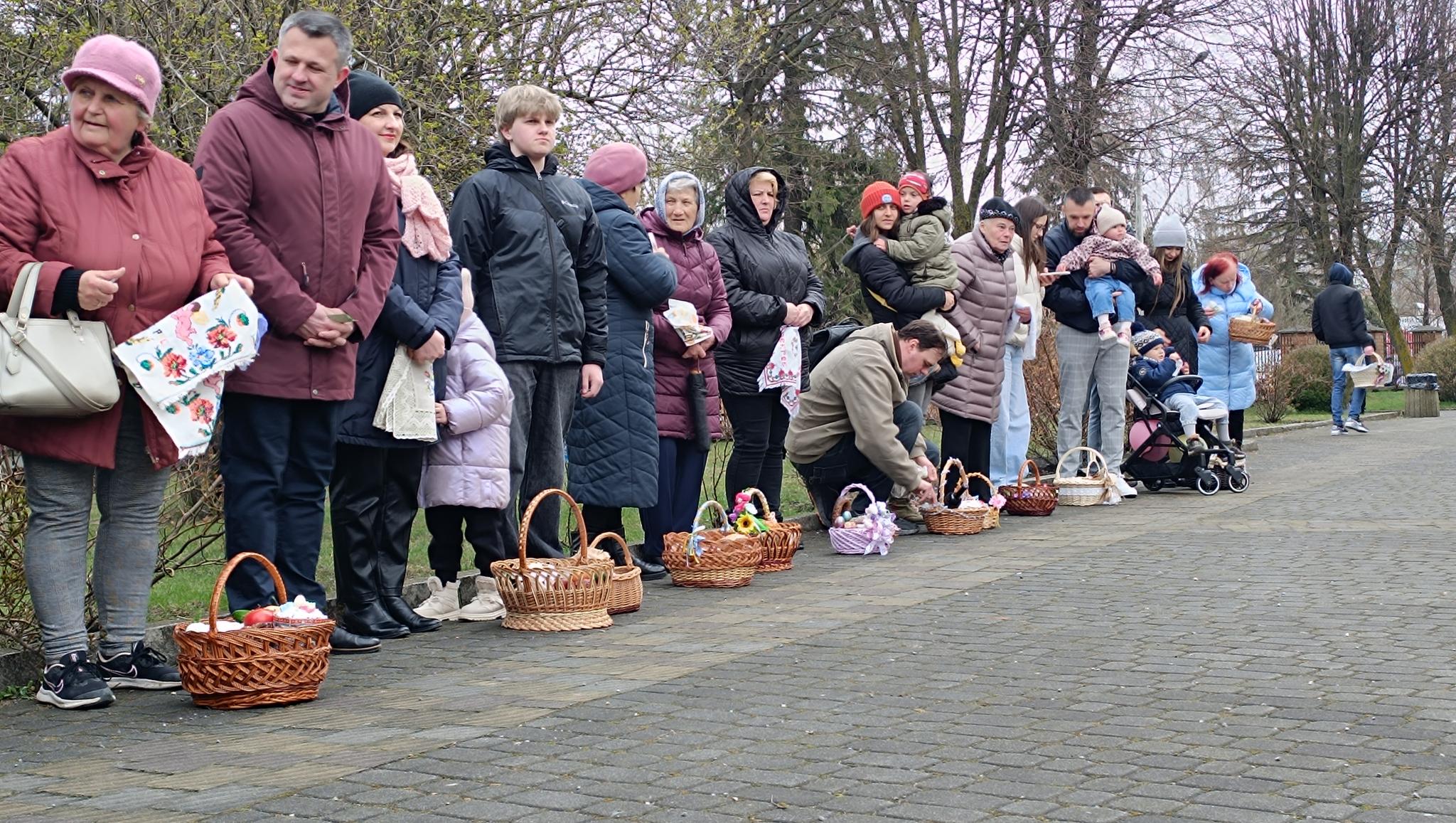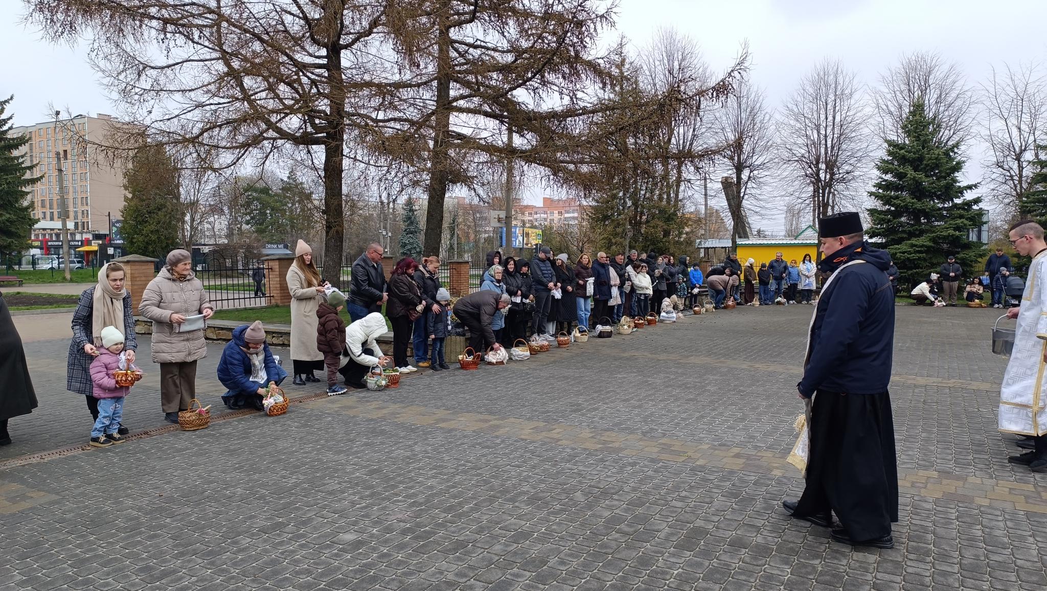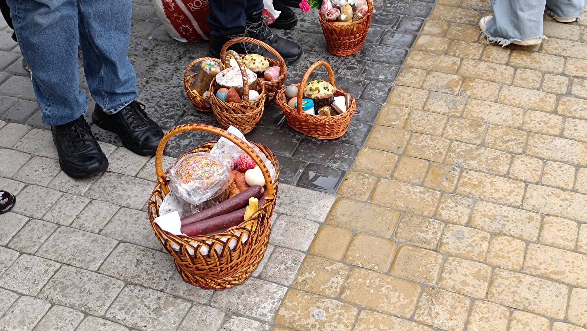 З 12 години освячують кошики у Кафедральному соборі Різдва Христового. На вулиці подекуди зривається дощ, та це не зупиняє вірян святити паски.