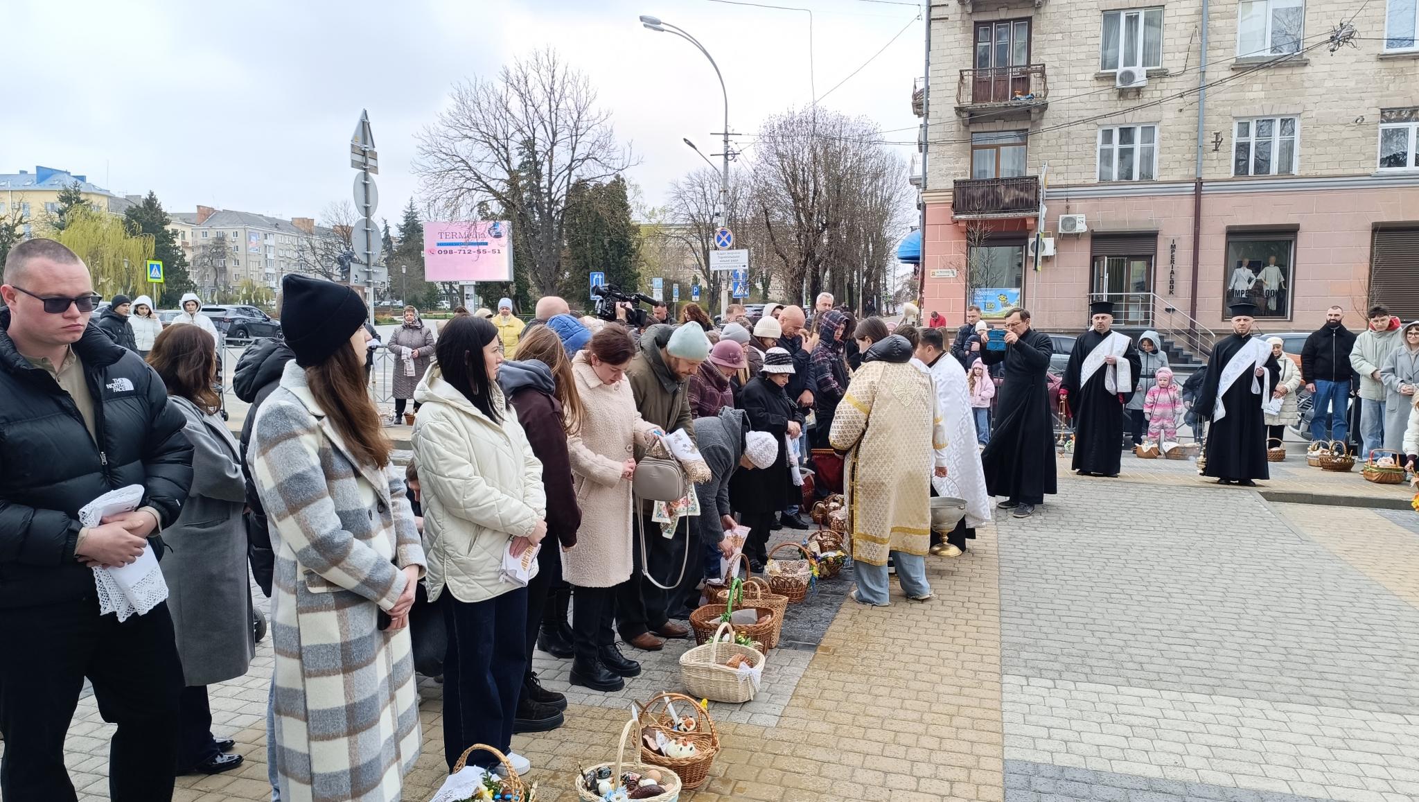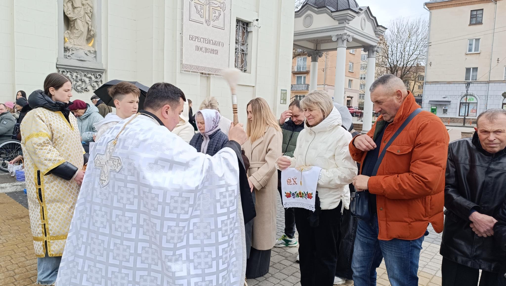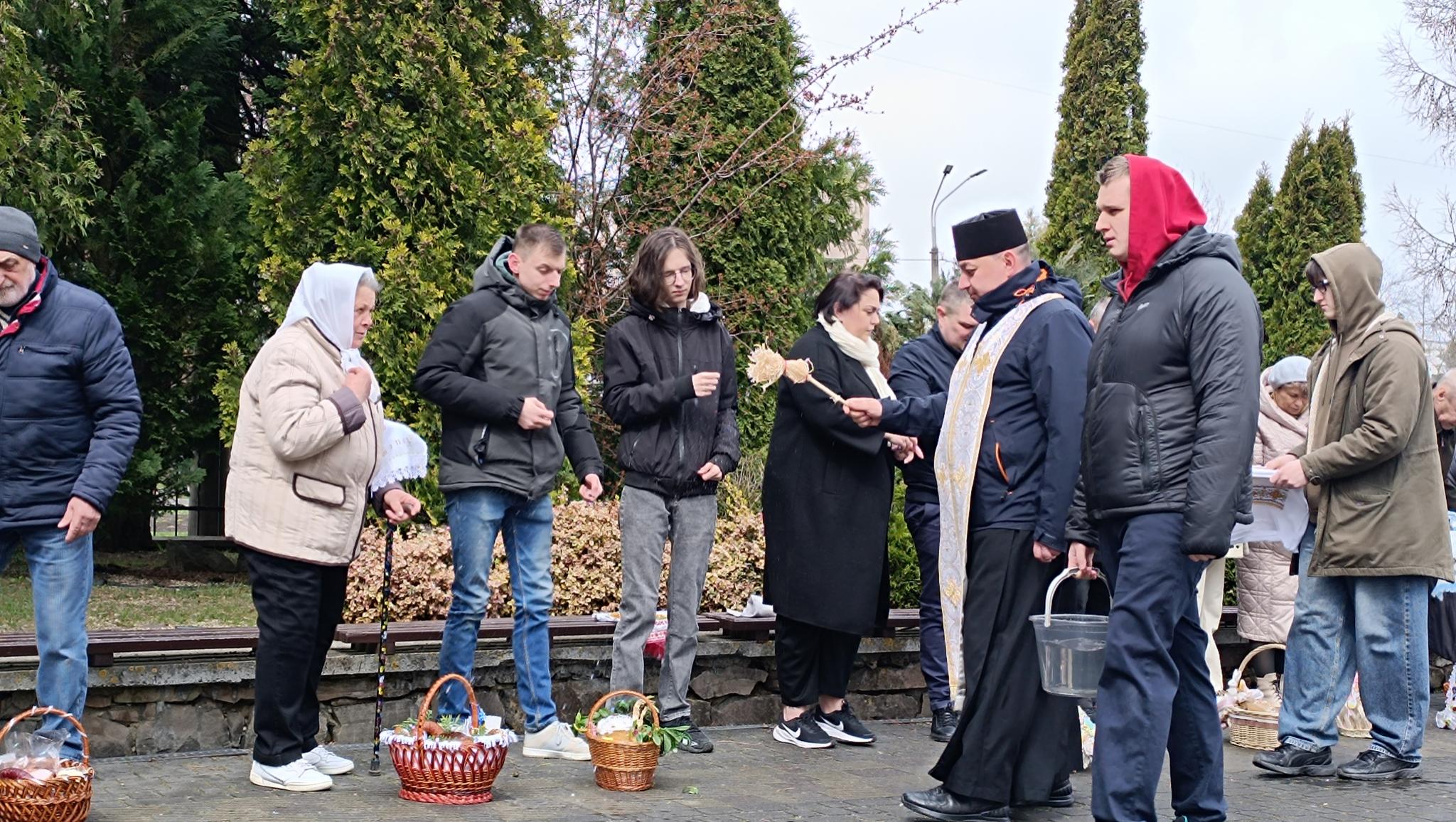 З 12 години освячують кошики у Кафедральному соборі Різдва Христового. На вулиці подекуди зривається дощ, та це не зупиняє вірян святити паски.