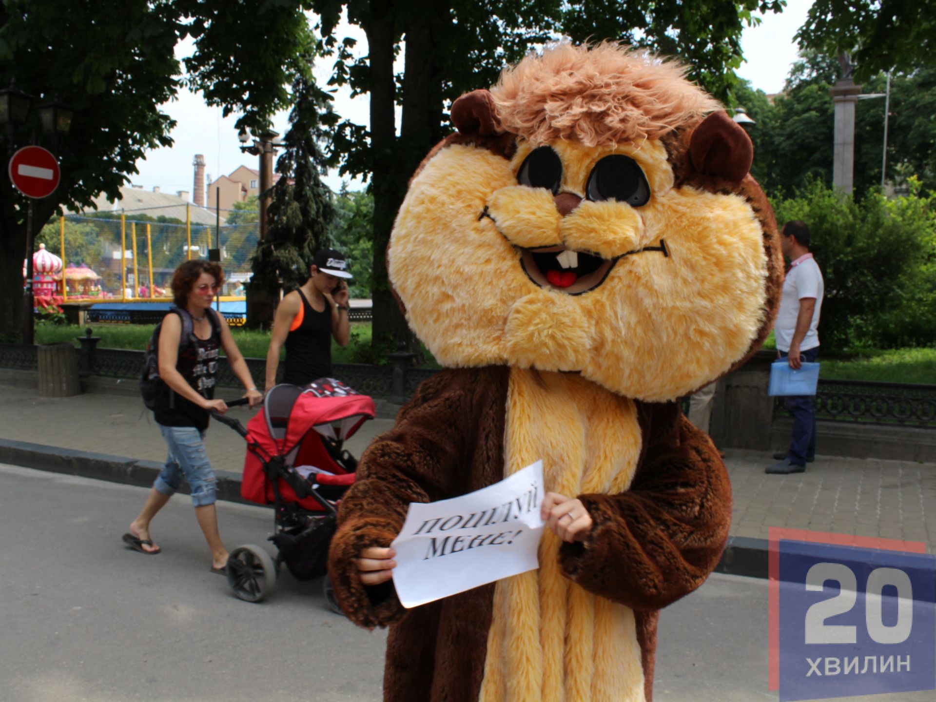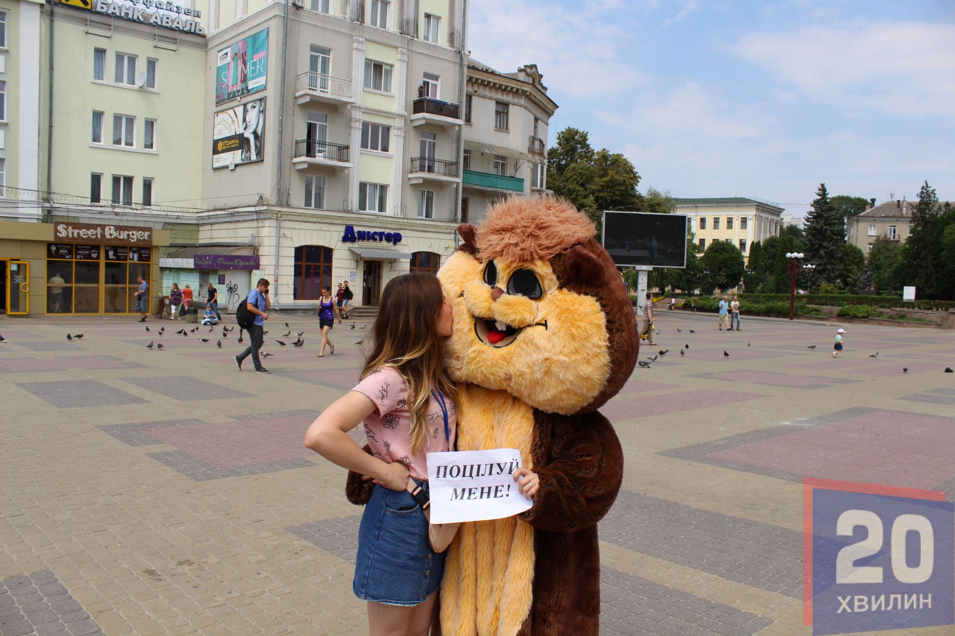 Тернополяни, які 6 липня 2018-го проходили Театральним майданом, бульв. Т. Шевченка та вул. Сагайдачного, не могли не помітити бурундука з табличкою руках "Поцілуй мене!".