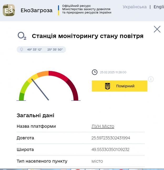 На сайті Міністерства захисту довкілля та природних ресурсів України у розділі «Екозагроза» журналісти промоніторили ситуацію – у Тернополі 25 лютого було справді все в межах норми. А зранку 26 лютого у районі пров. Дівочий показник знову підстрибнув догори.