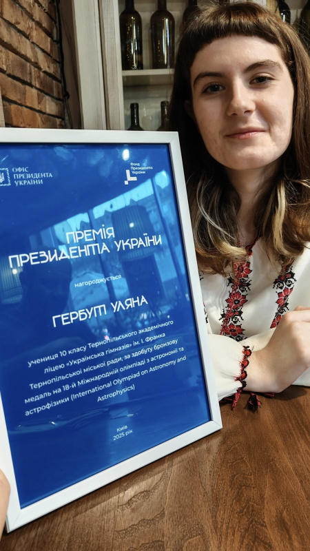 Випускниця Тернопільського академічного ліцею «Українська гімназія» імені Івана Франка 2025 року Уляна Гербут отримала з рук Зеленського сертифікат на здобуття премії Президента України.