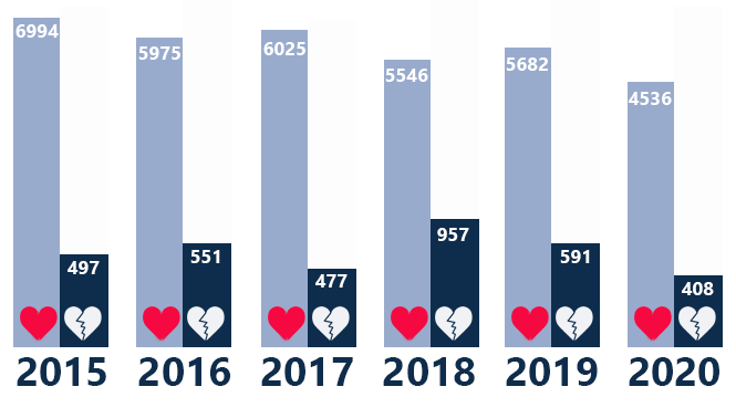 Статистика одружень та розлучень на Тернопільщині за 2015-2020 роки свідчить про те, що за минулий, 2020 рік, кількість розлучень зменшилася. У важкому 2020 році було 408 розлучень, що майже вдвічі менше, ніж у 2018 році, тоді було 957. Виходить, карантин вплинув на сімейну згуртованість, навчив цінувати найцінніше? А можливо, подружжя боялися пандемії…