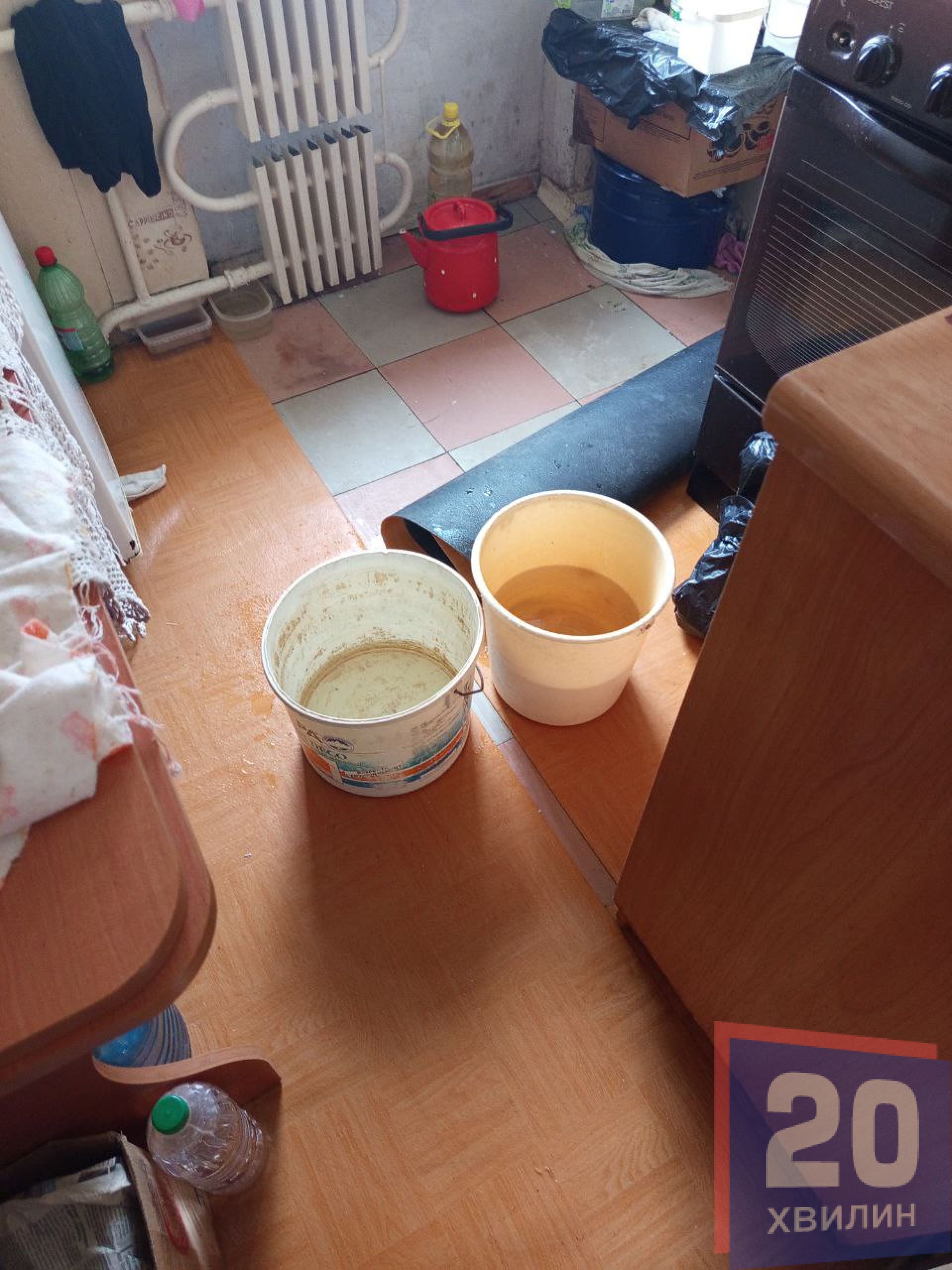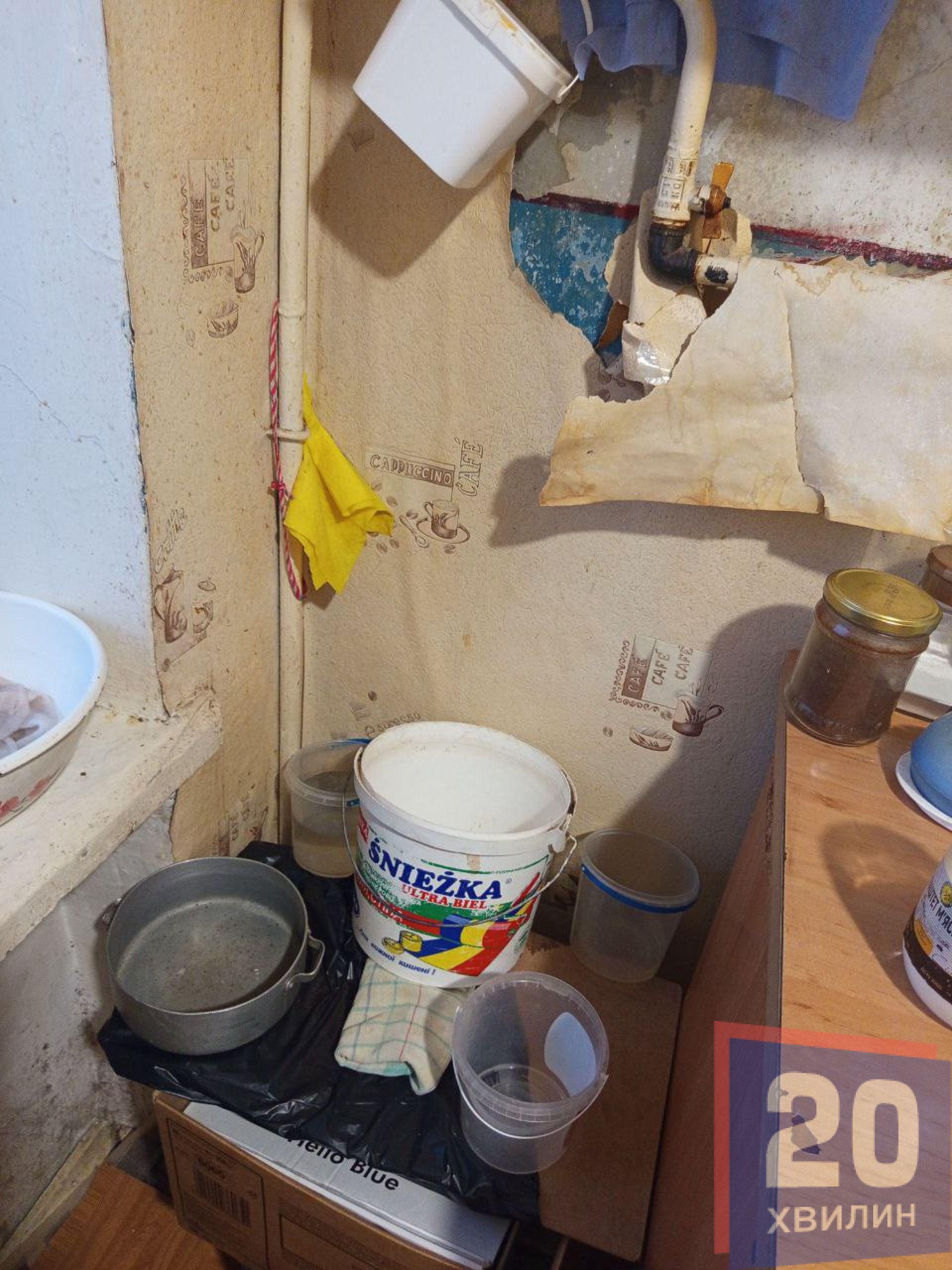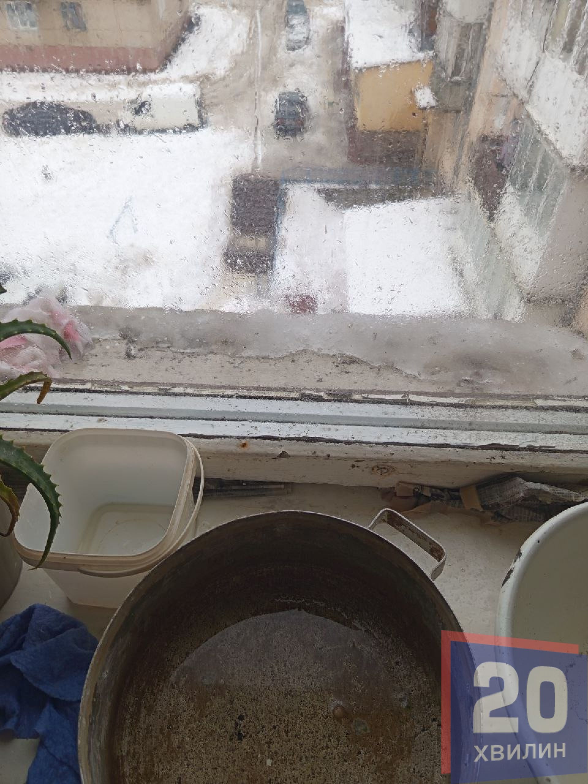 — Вона текла по стіні у кухні, з вікна, а згодом почала капати навіть зі світильника, — каже пані Олена. — Я всю ніч збирала воду в миски, не спала, сиділа при відкритій кватирці без світла, з ліхтариком. У квартирі холодно, постійна волога, є ризик пошкодження техніки. Вже скоро на холодильник потече.