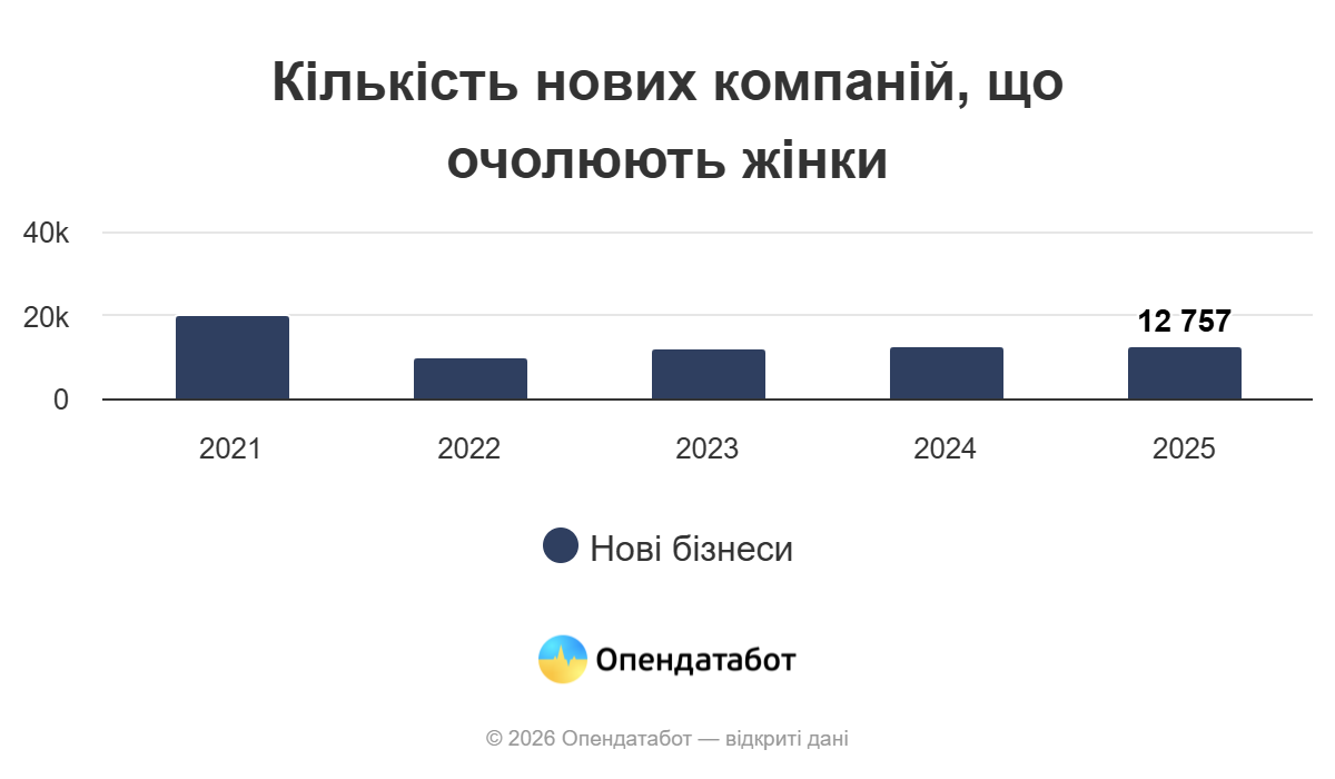 12 757 нових компаній очолили жінки у 2025 році. Наразі на жінок-директорок припадає 34% від загальної кількості новостворених компаній. Це майже стільки ж, як і до початку повномасштабної війни.