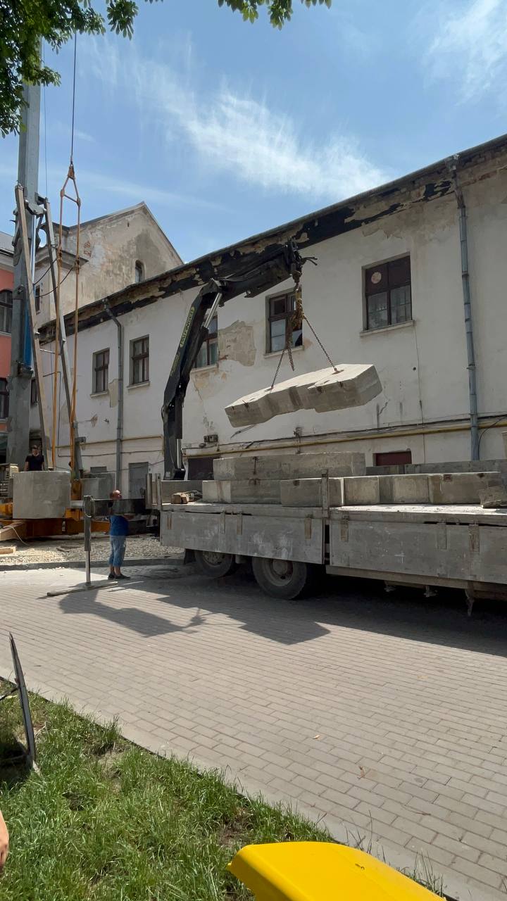 Вже о 13.00 частину території Архикатедрального собору перекрили сигнальними стрічками та дорожніми знаками. На місце заїхала будівельна техніка. Підрядники майже одразу почали закріплювати залізні гачки на бетоновані конструкції та спускати їх з вантажівки на землю.
