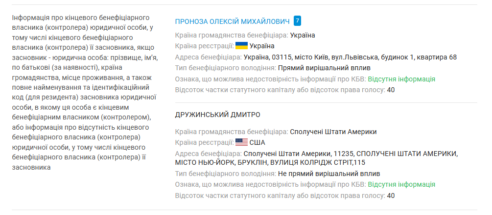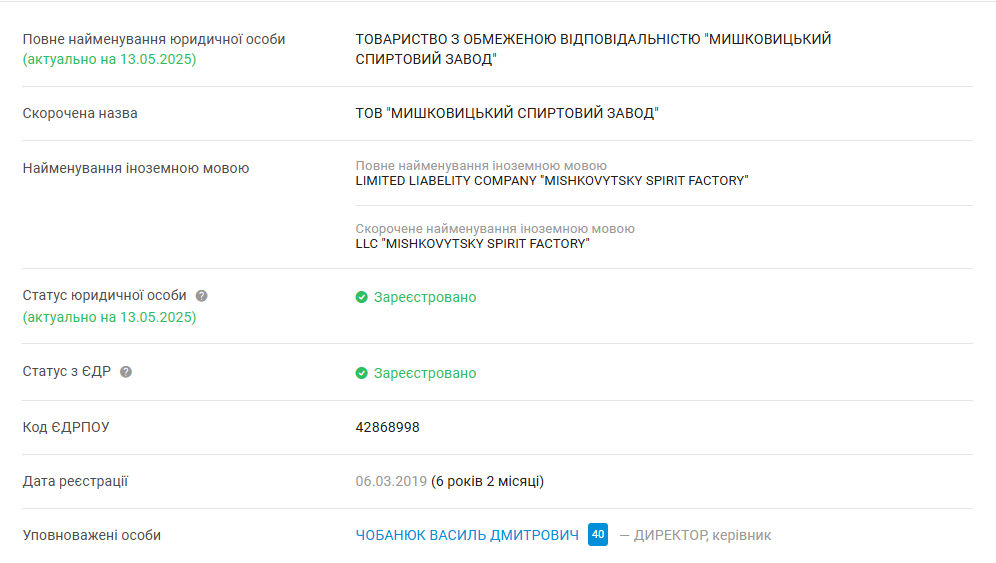 За даними порталу YouControl, ТОВ «Мишковицький спиртовий завод» працює з березня 2019 року. Основний вид діяльності — дистиляція, ректифікація та змішування спиртних напоїв. Серед бенефіціарів вказані киянин Олексій Проноза та громадянин США Дмитро Дружинський. Директором підприємства є Василь Чобанюк. Скріни-підтвердження надаємо нижче.