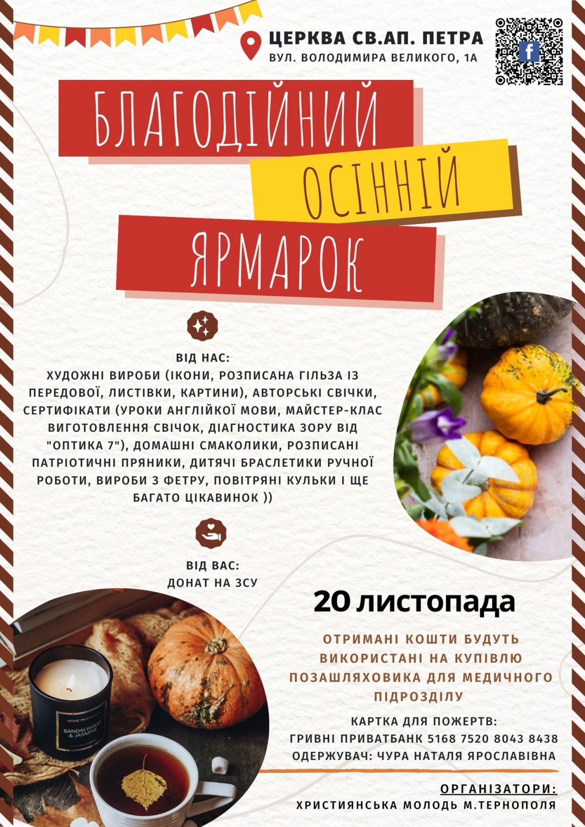У неділю, 20 листопада, в церкві Св. Ап. Петра відбудеться благодійний осінній ярмарок, який організовує християнська молодь Тернополя.