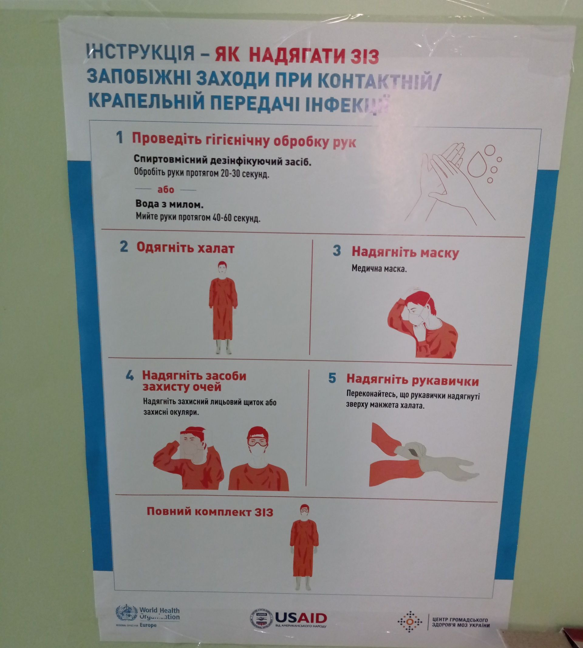 Але, щоб потрапити до приміщень, де перебувають хворі – потрібно одягнути костюм біологічного захисту. Жодна частина тіла не може бути відкритою. Одягати засоби захисту – справжня процедура, яка потребує зусиль. Медики можуть робити це швидко. Спершу одягають маску-респіратор, шапочку на волосся та першу пару рукавичок. Респіратор надійно фіксують – його зав’язують, щоб не було ніяких щілин. Далі йде одноразовий костюм біологічного захисту. Це комбінезон, який закривається на застібку-блискавку. На руки ще одна пара рукавичок. На ноги – спеціальні бахіли, які зав’язують. Останній елемент захисту – щиток. Це єдиний предмет, який використовують повторно, а не утилізують.