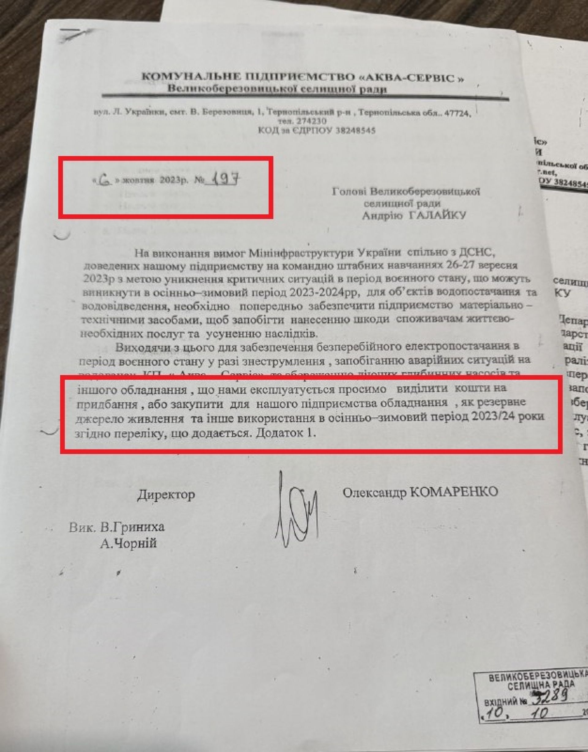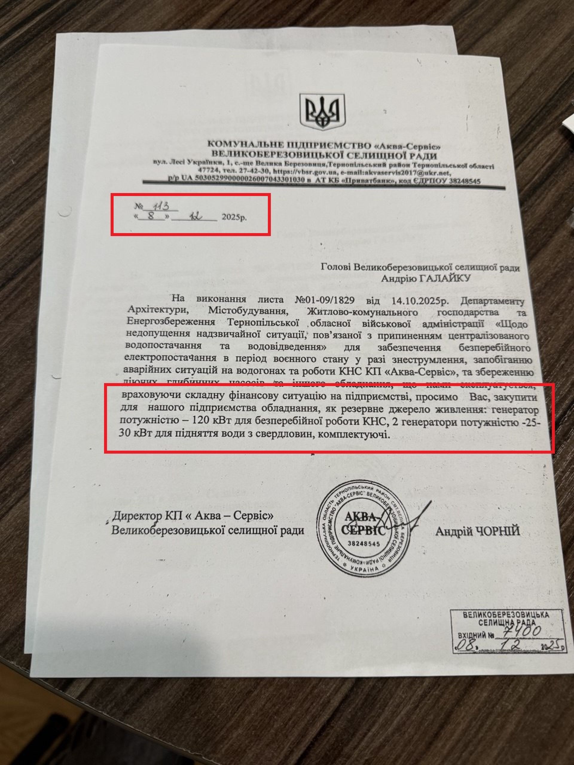 Натомість мешканці запевняють, що проблеми не із КП, а з бездіяльністю місцевої влади. За нашою інформацією, про необхідність закупівлі потужних генераторів керівники фірми «Аквасервіс», яка постачає воду, говорили від 2023 року. Неодноразово надсилали письмові запити і восени, і взимку 2025-го. Редакція отримала документи, що підтверджують ці слова. Втім, як кажуть джерела, ніякої допомоги від селищної ради не отримали.