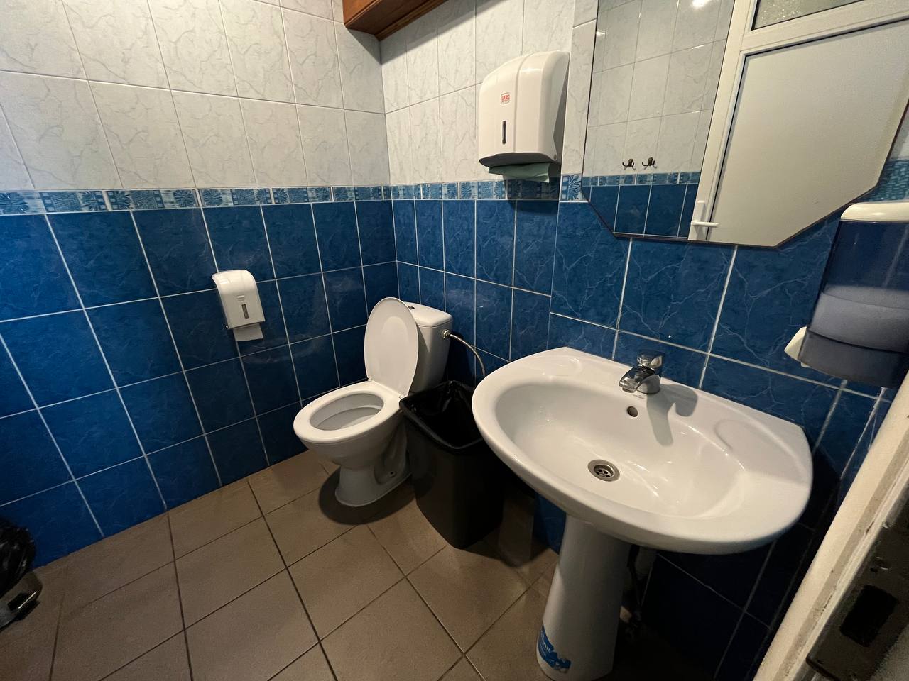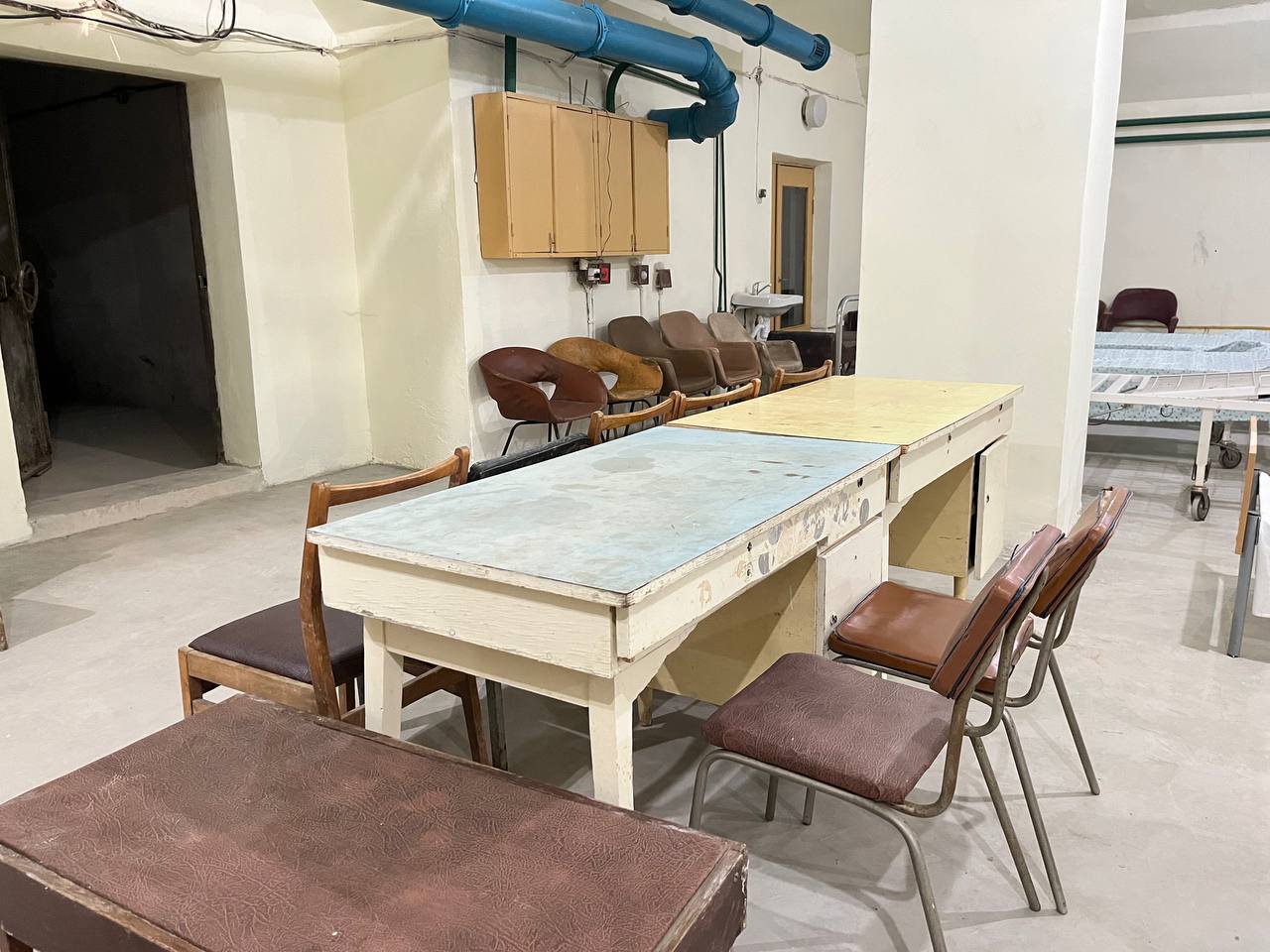 У приміщенні, яке виділили для укриття, є дві вбиральні та душові. Туалети нещодавно оновлені, з необхідною сантехнікою та гарячою водою. А ось душові вже давно потребують ремонту. Там оббита плитка, іржа, стара сантехніка. Далі потрапляємо в приміщення, де пацієнти можуть полежати або посидіти. Тут встановили ліжка з матрацами та білизною, стільці, пуфики, столи.