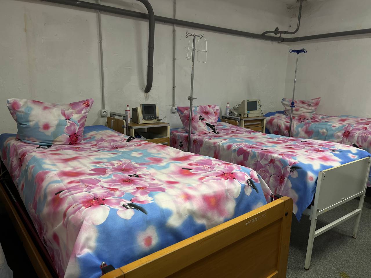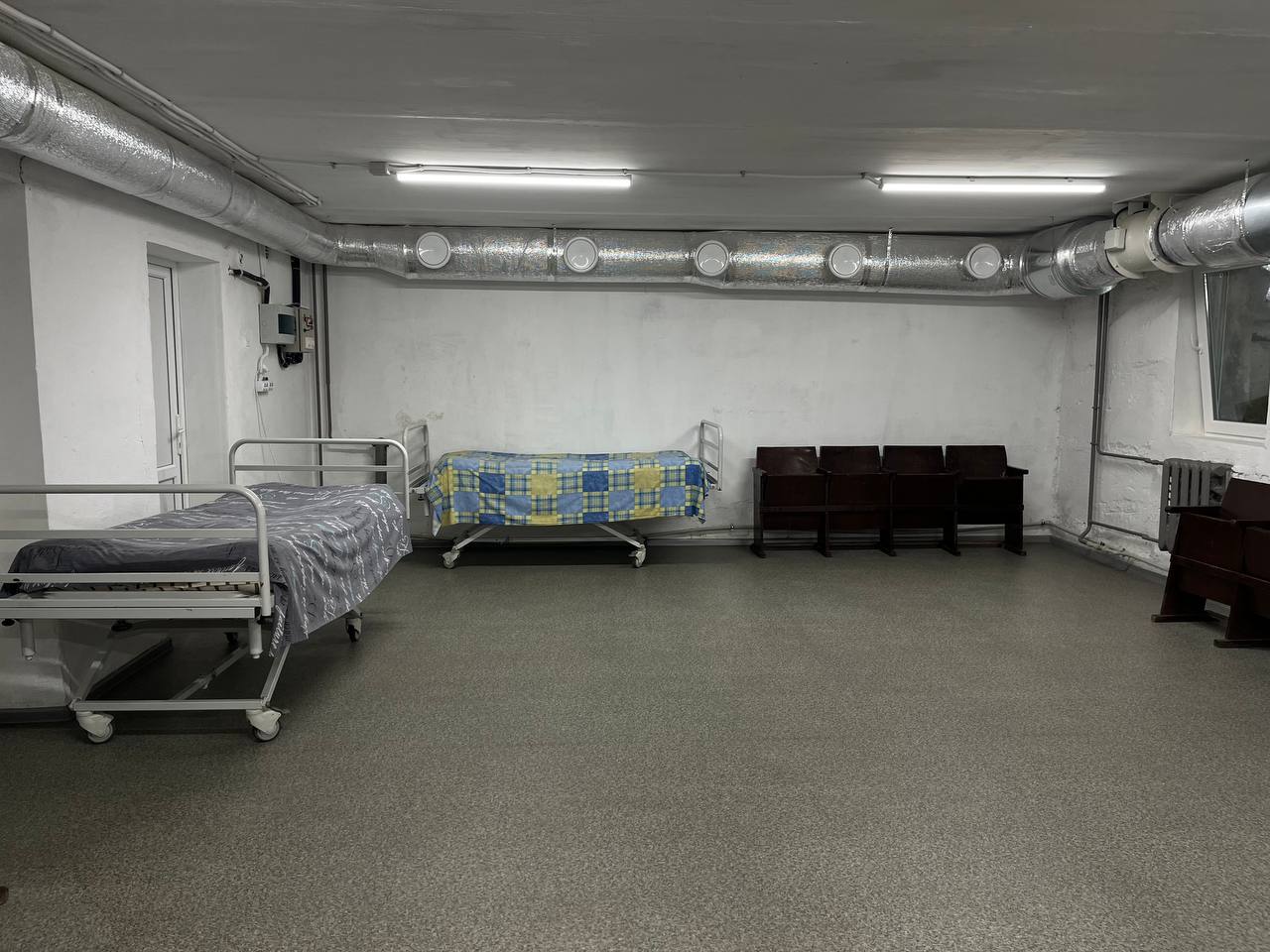 Для пацієнтів інфекційного відділення у напівпідвальному приміщенні облаштували окреме укриття, побачили журналісти. Там є коридор, одна невелика кімната та вбиральня. У кімнаті встановили три ліжка, кілька стільців та поличку з медикаментами.