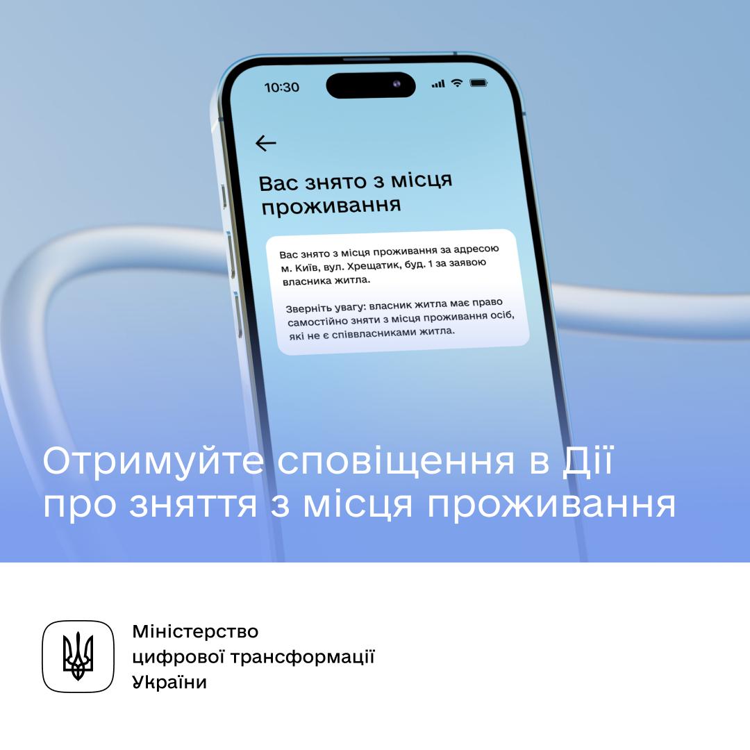 «З «Дією» — жодних сюрпризів. Коли власник випише вас з квартири чи будинку – «Дія» одразу надішле push-сповіщення», — зазначили у міністерстві.
