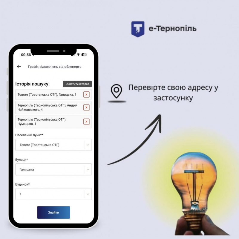 У додатку «е-Тернопіль» можна зберігати адресу для перегляду графіків відключень електроенергії