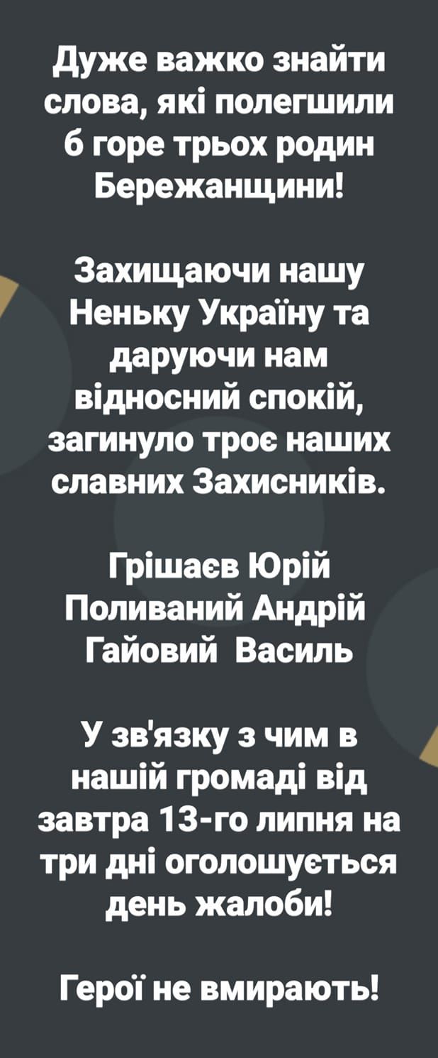 - В Бережанській громаді з 13 липня оголосили три дні жалоби.