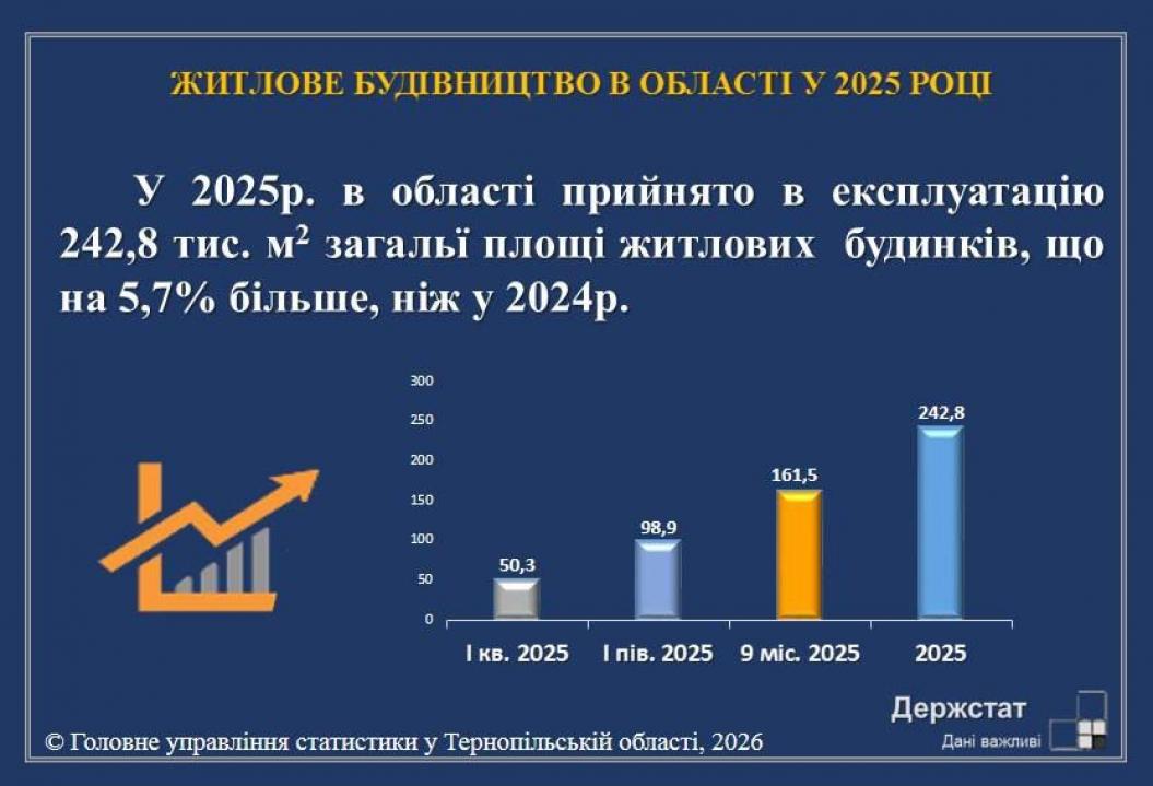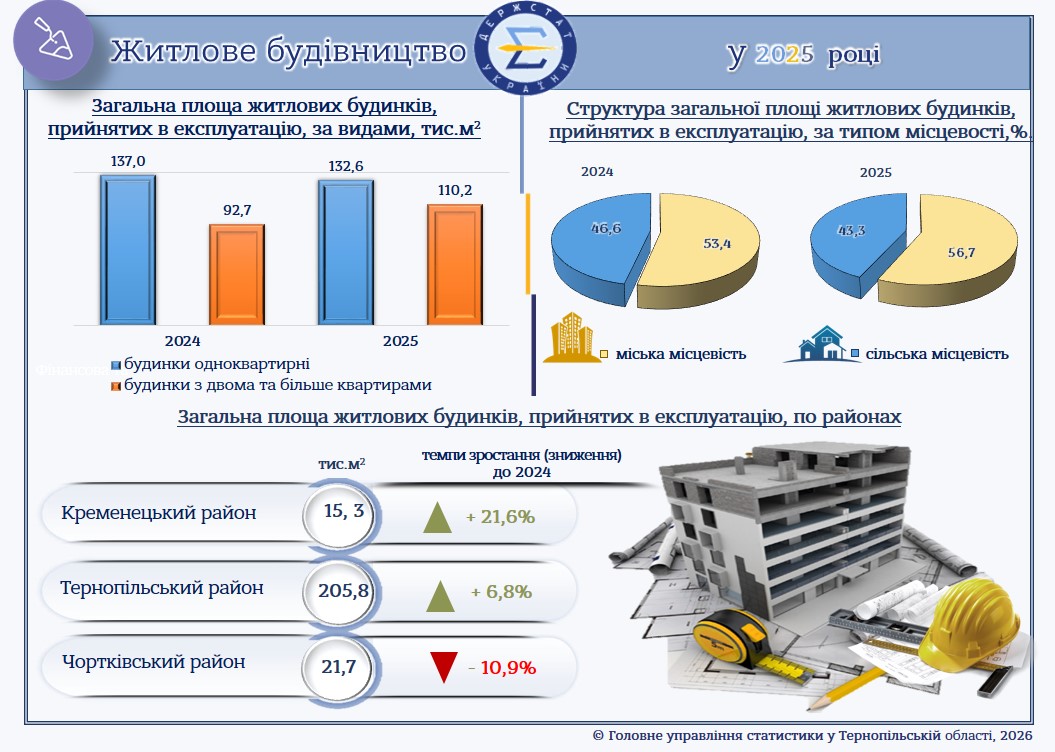 За даними Головного управління статистики у Тернопільській області, яке оприлюднило дані щодо житлового будівництва в області у 2025 році, у міській місцевості прийнято в експлуатацію 56,7% загальнообласного обсягу житла (137,7 тис.м.кв.), в сільській – 43,3% (105,1 тис.м.кв.).
