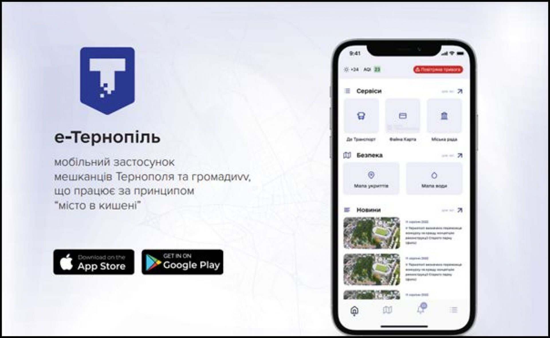 «e-Тернопіль» — це мобільний застосунок для тернополян та жителів громади, де зосереджені міські сервіси. Він доступний для завантаження на App Store чи Play Market від 1 грудня 2022 року.
