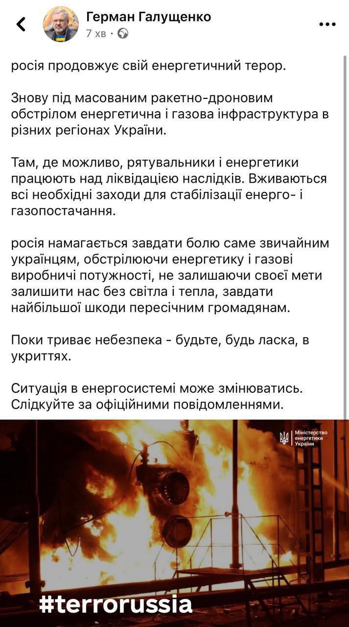 Як Про це повідомив міністр енергетики України Герман Галущенко у Facebook, під обстрілом РФ енергетична та газова інфраструктура України.