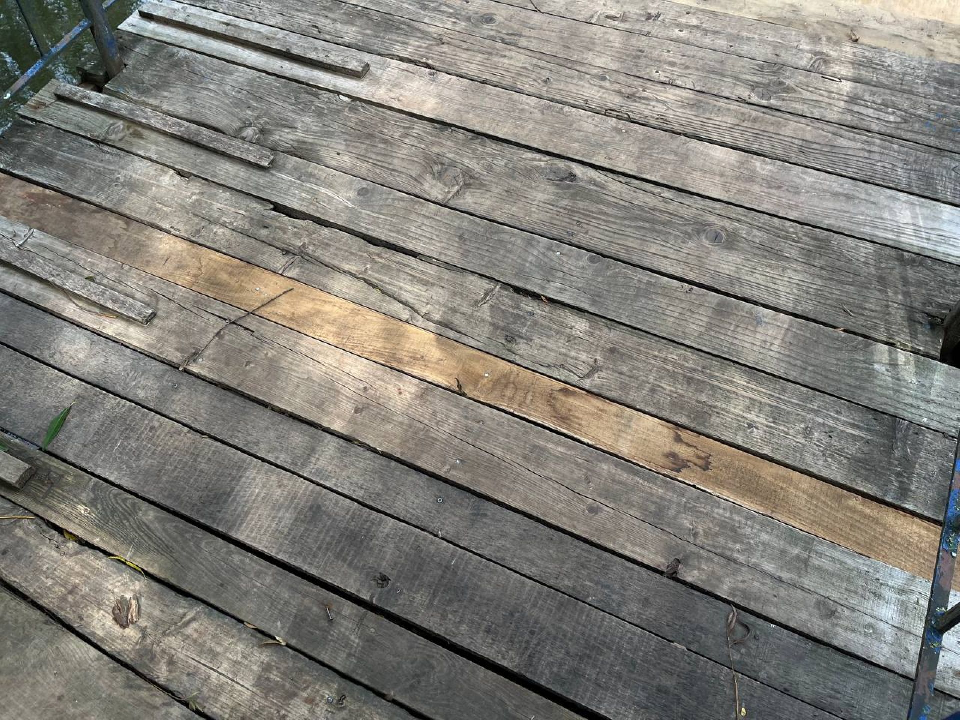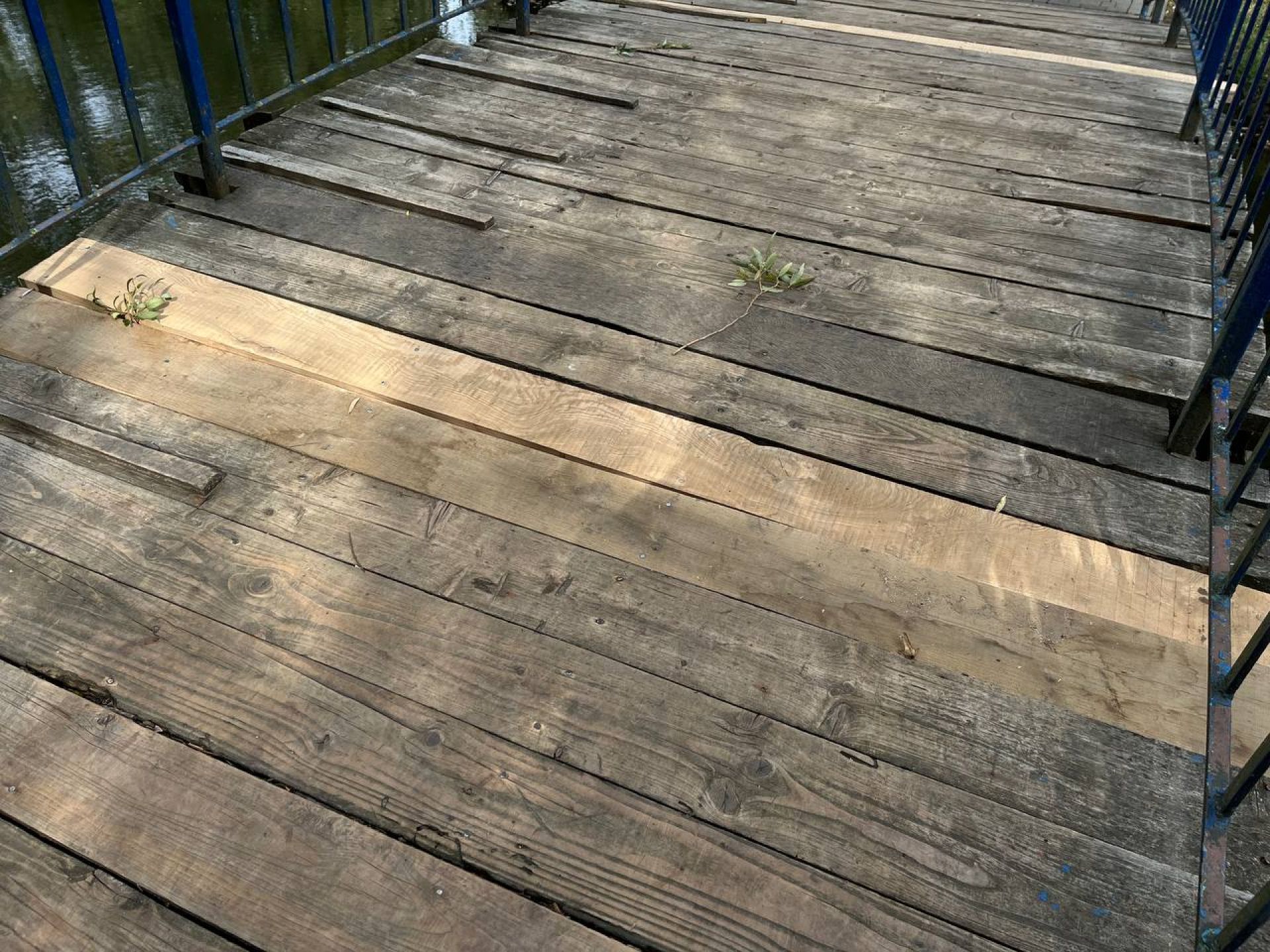 У перекритті утворилися чимало дірок, частина однієї з дощечок взагалі відламалася. Через дірки вже видно водойму.