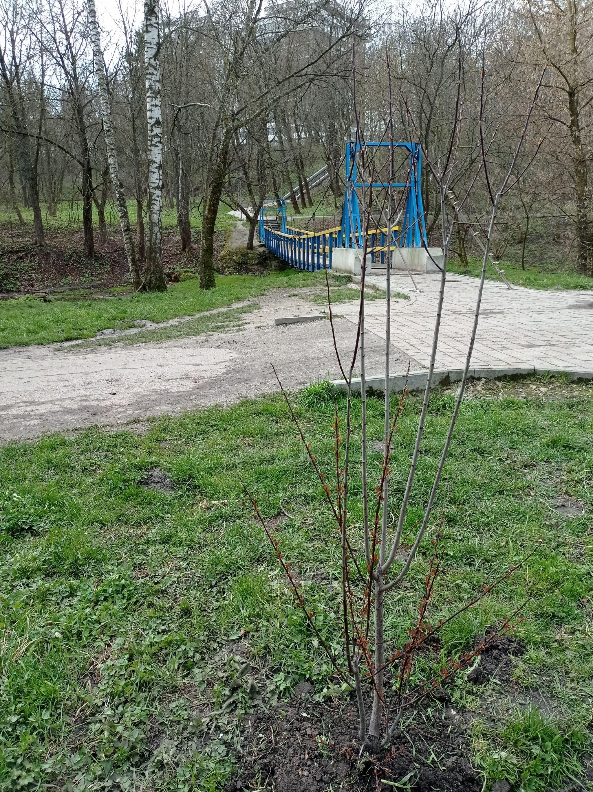 Саджанці дерев висадили вздовж пішохідних алей біля підвісного мосту. Сливи вже розпускають листя. Комунальники розповіли - ці дерева висадили на ділянці, де немає високих дерев, тож їх не будуть затіняти інші насадження і сливи мають прижитися.