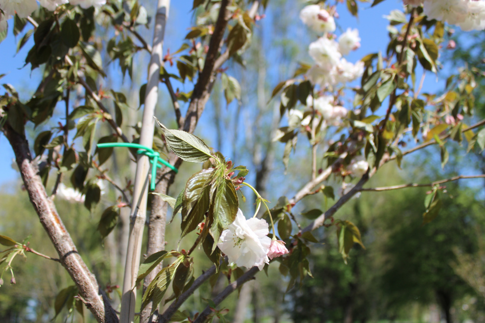 Серед насаджень – клен японський, дуб болотний, пагода японська, зелкова японська, кипарис болотний та сакура.