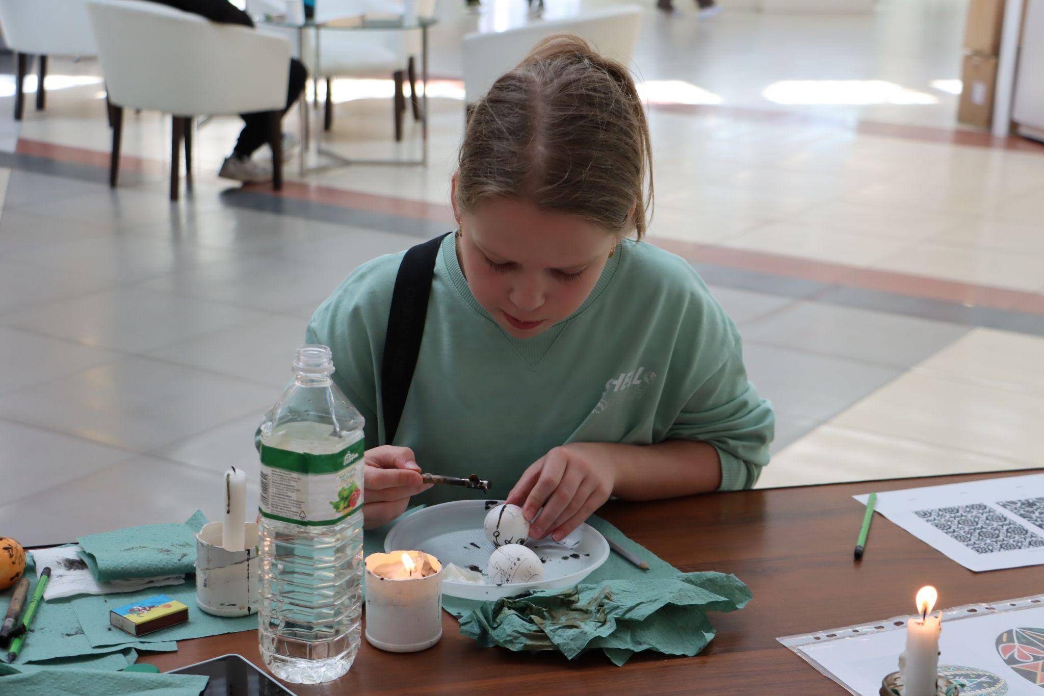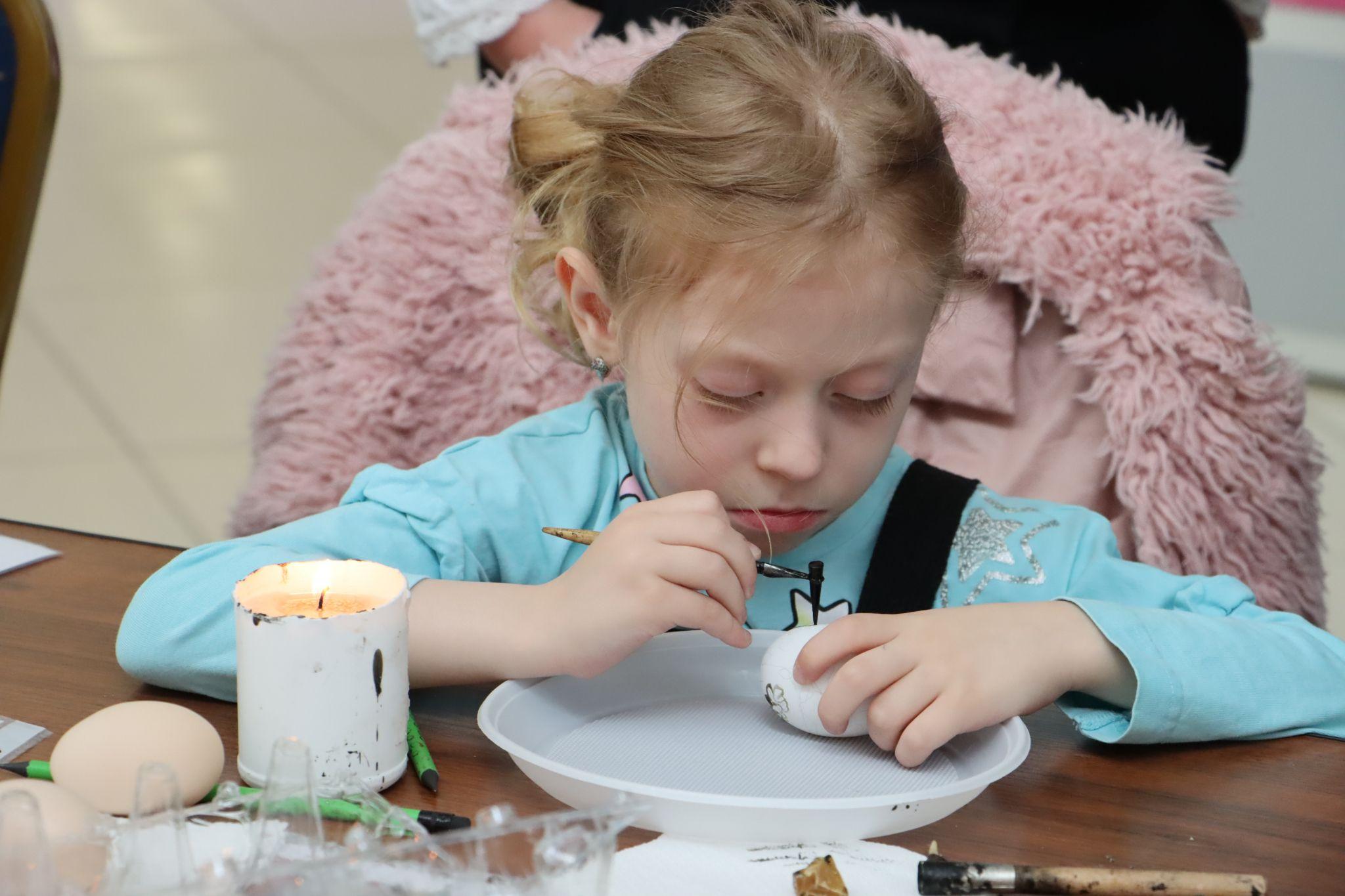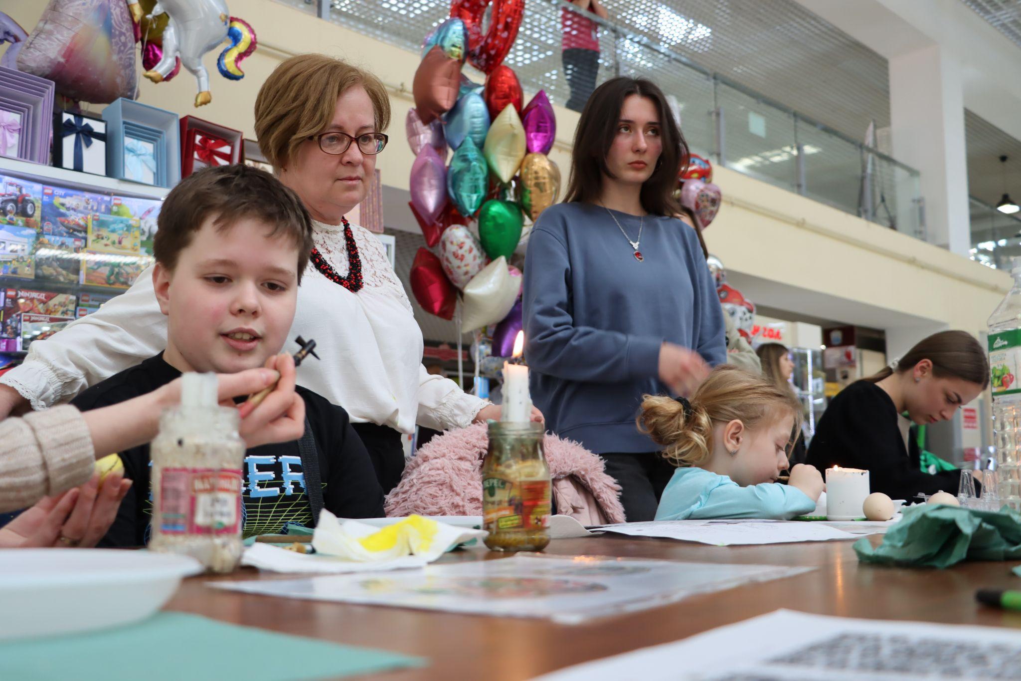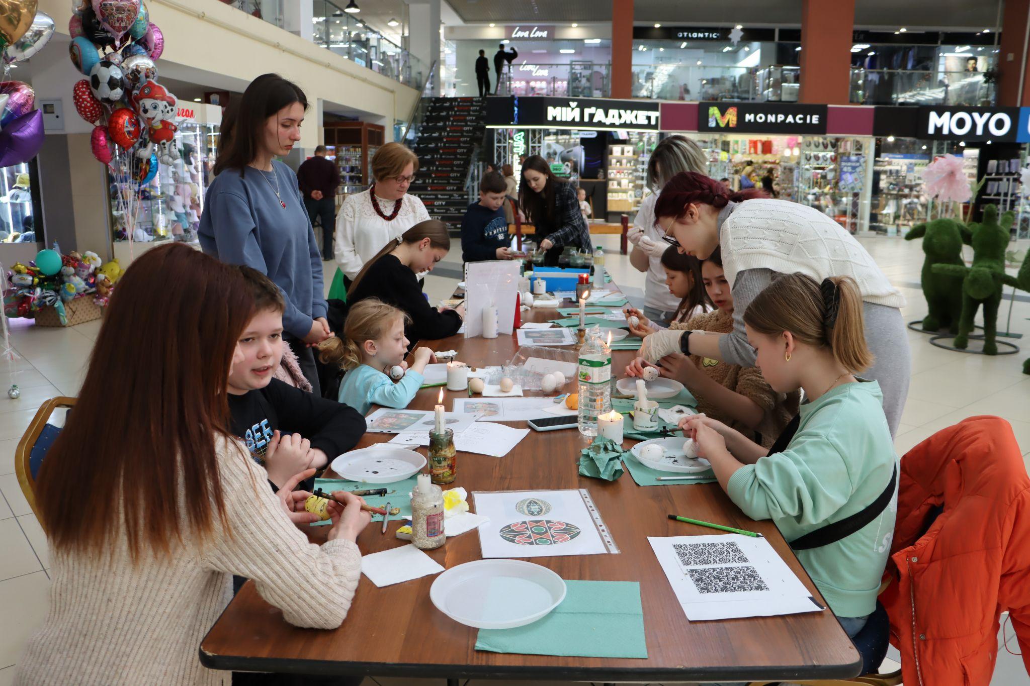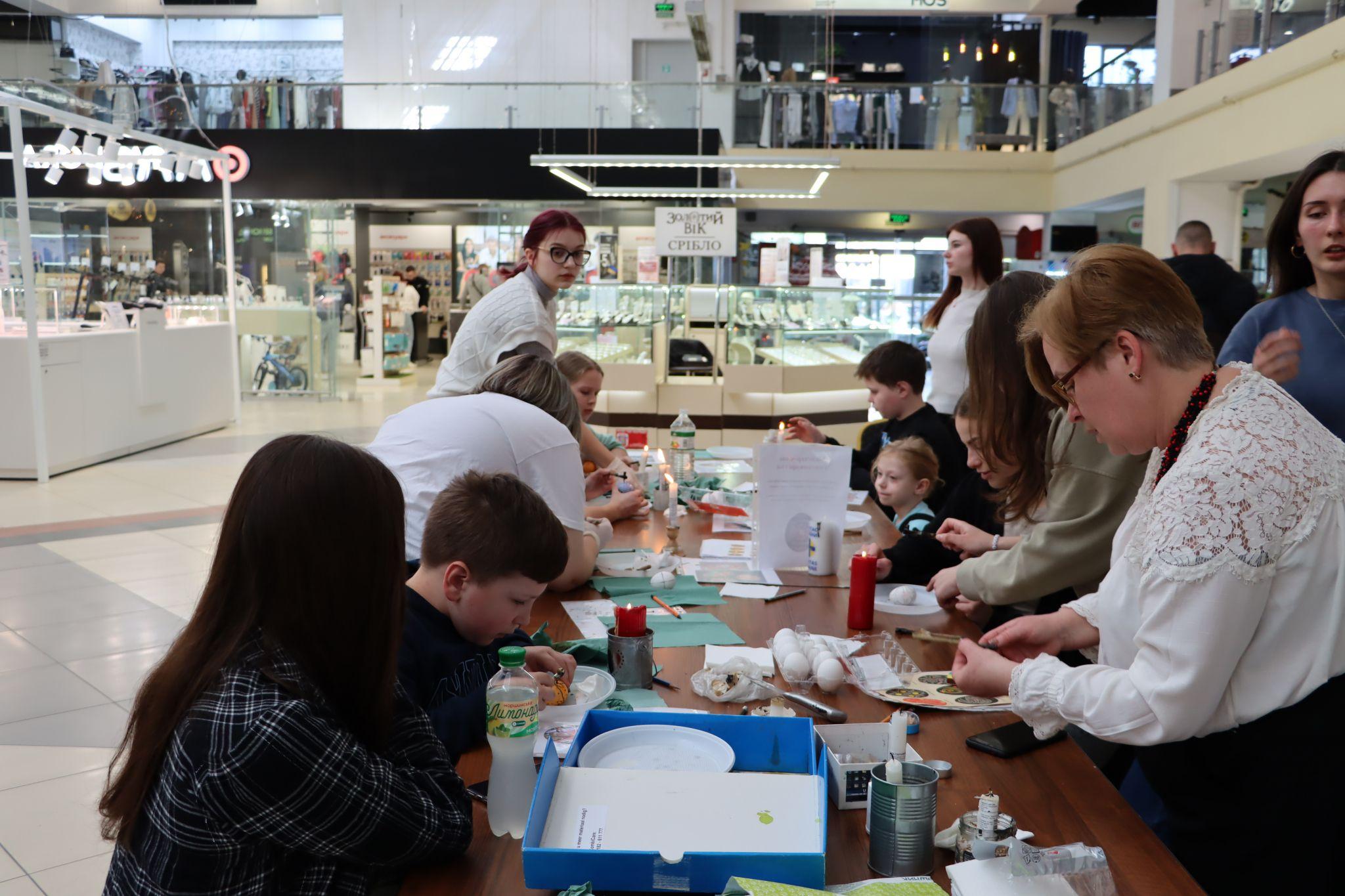 У холі «Подолян», там, де постійно відбуваються різні концерти й благодійні заходи, поставили кілька столів. Організатори забезпечили учасників яйцями, воском і свічками, щоб його розігрівати, писачками і кольоровими барвниками. То тут, то там лежали роздруківки з орнаментами, які можна нанести на писанку. До майстер-класу на момент наших відвідин долучилися десятеро дітей.