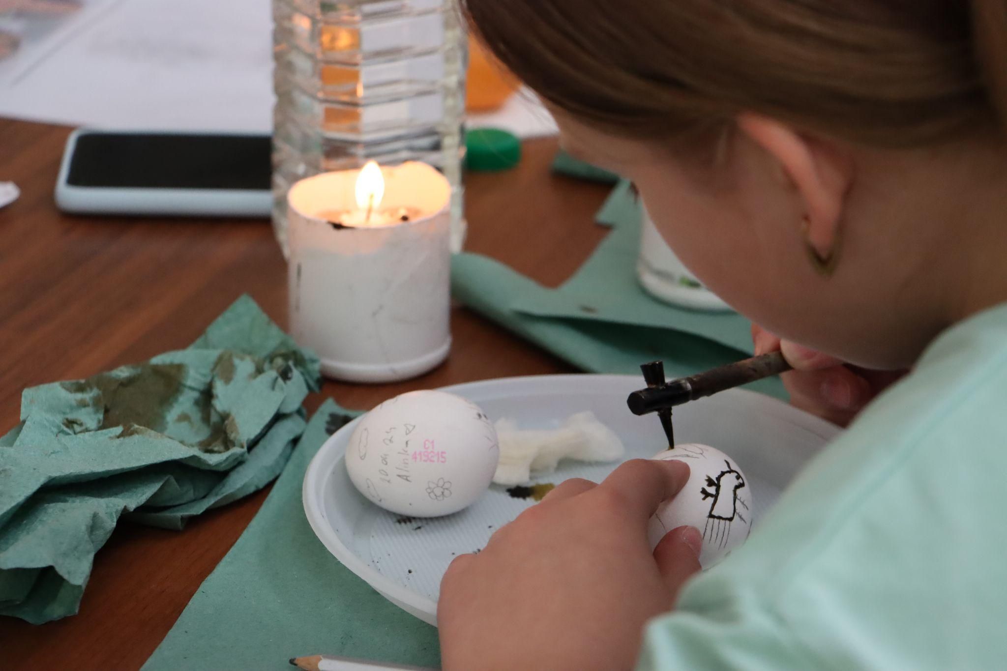 З учасниками заходу працюють студенти освітньої програми «Середня освіта (Образотворче мистецтво)». Це майбутні педагоги-художники. За словами пані Ірини, вони непогано володіють усіма техніками писанкарства і паралельно навчаються працювати з малечею.