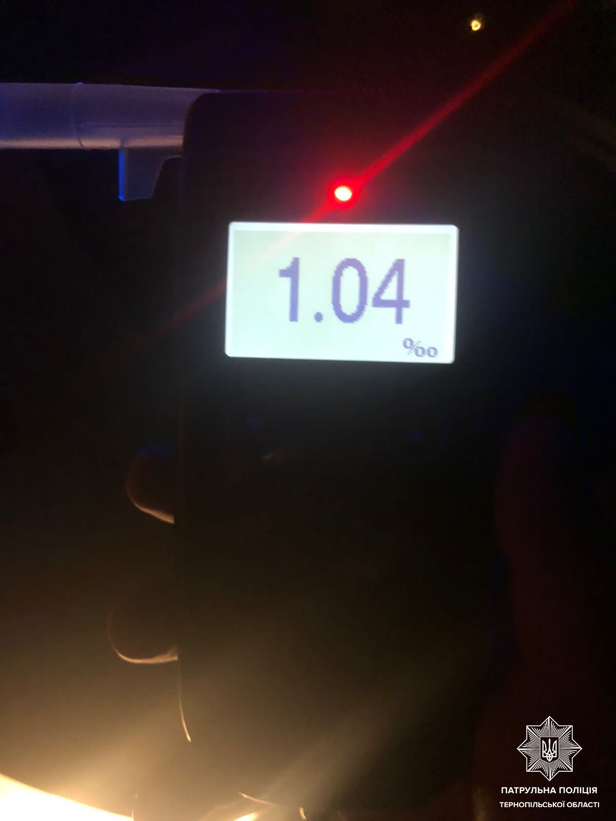 Патрульні запропонували чоловікові пройти огляд на стан сп'яніння на місці за допомогою алкотесту Драгер, на що він погодився. Результат огляду виявився позитивним, прилад зафіксував 1,04 проміле алкоголю в крові водія.