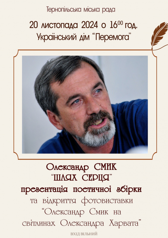 20 листопада о 16:00 год. у фоє Українського Дому відбудеться презентація поетичної збірки Олександра Смика «Шлях серця» та відкриття фотовиставки «Олександр Смик на світлинах Олександра Харвата».