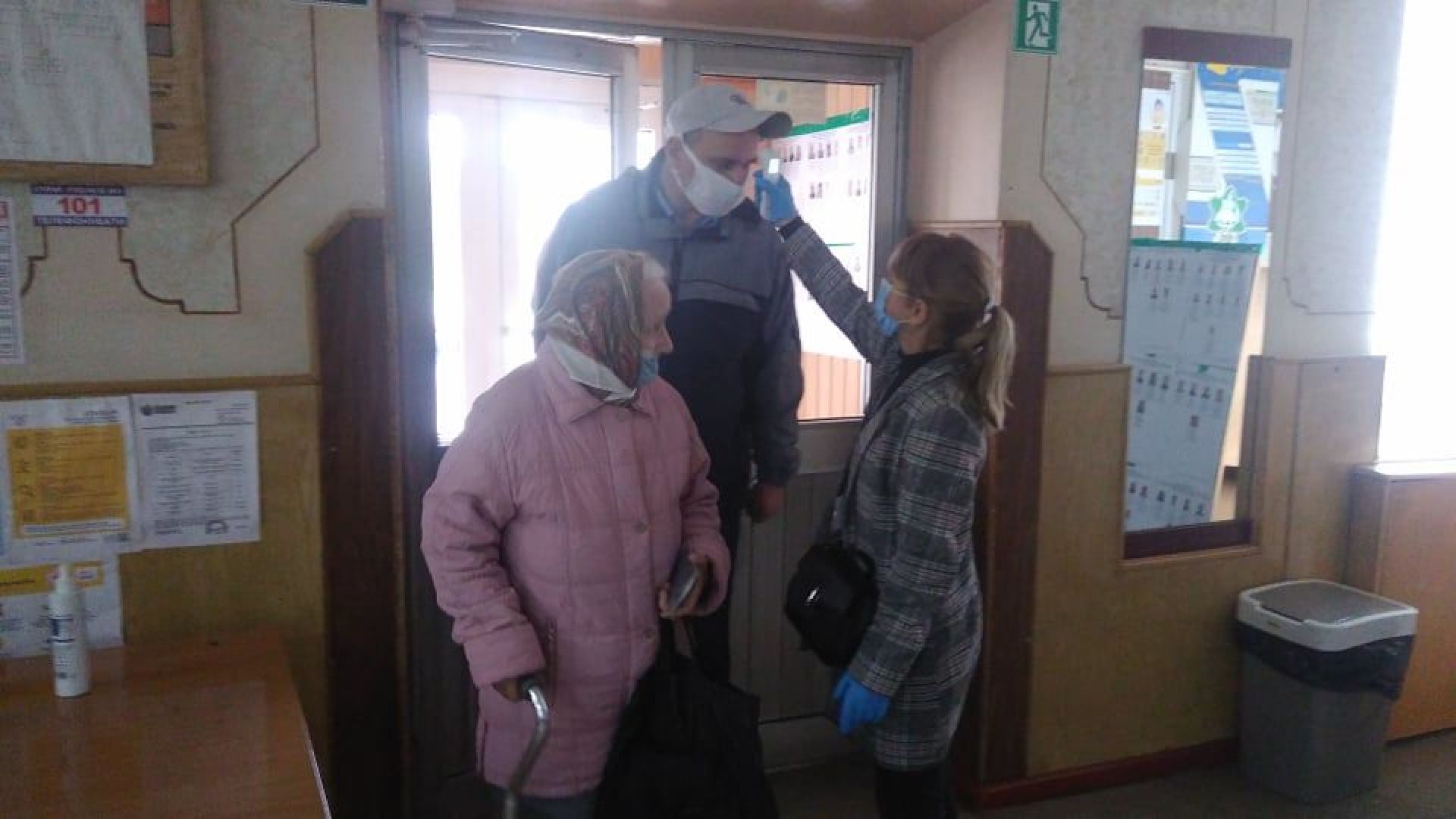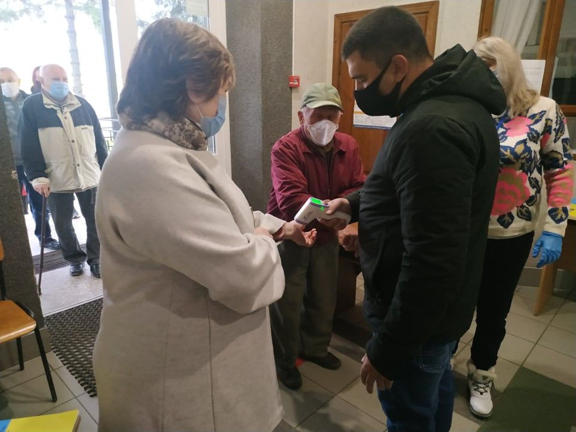 Перед відкриттям дільниці всім присутнім виміряють температуру. Окрім температурного заміру, всім виборцям дезинфікують руки.