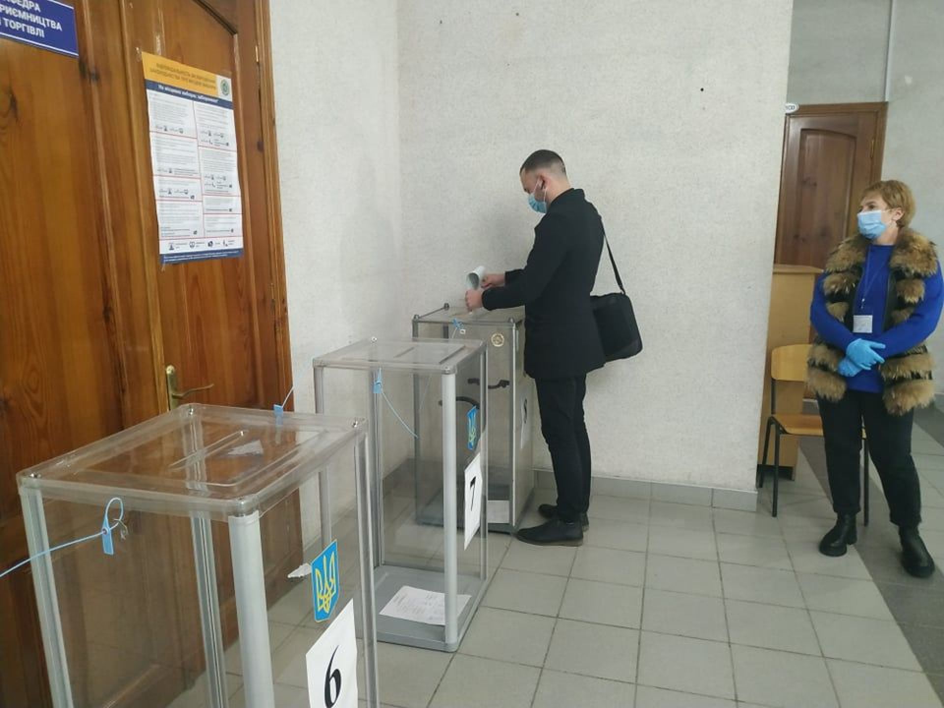 Виборців всім перед входом проводять температурний замір, є дезинфектори, повідомляє наш журналіст Федір Восінський.