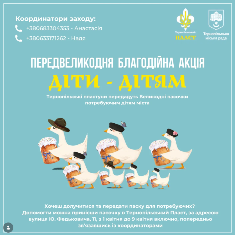 Допомогти можна, принісши паску до Тернопільської Пластової Домівки за адресою вул. Федьковича 11, із 1 до 9 квітня (четвер) включно, попередньо зв'язавшись з координаторами.