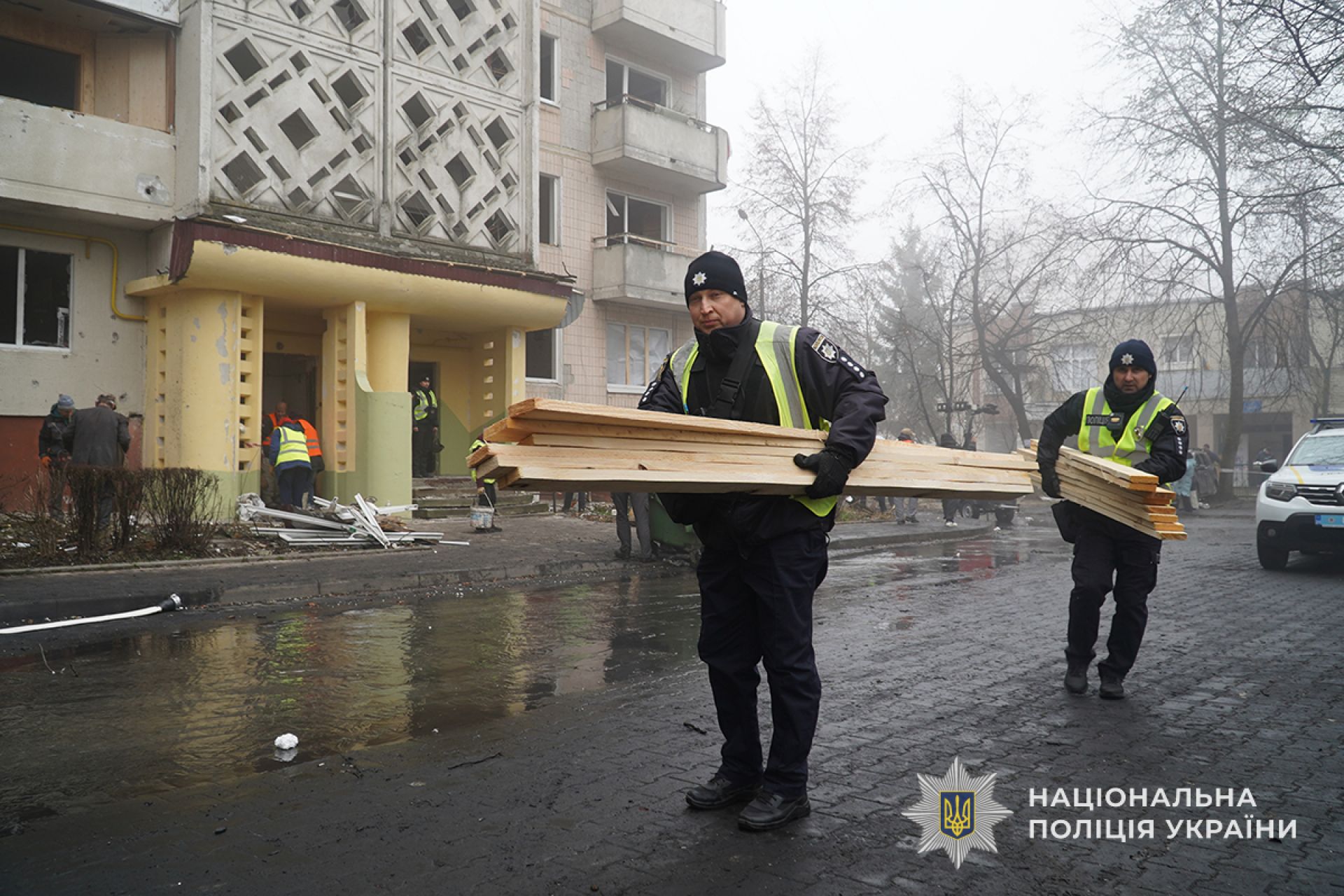 "Поліцейські на даній локації забезпечують охорону громадського порядку, забезпечують охорону пошкодженого майна громадян від мародерства, а також допомагають людям, чим можуть. Для прикладу, проводять людей, які хочуть забрати свої речі з під'їздів, допомагають людям підносити будматеріали, забирати речі з квартир, надають консультації, куди люди можуть звернутися у разі написання заяв по пошкодження майна, щодо відновлення документів, які були втрачені під час обстрілу, а також по інших питаннях, з якими до нас звертаються громадяни", - розповідає начальник управління превентивної діяльності ГУНП в Тернопільській області Іван Рибчак.