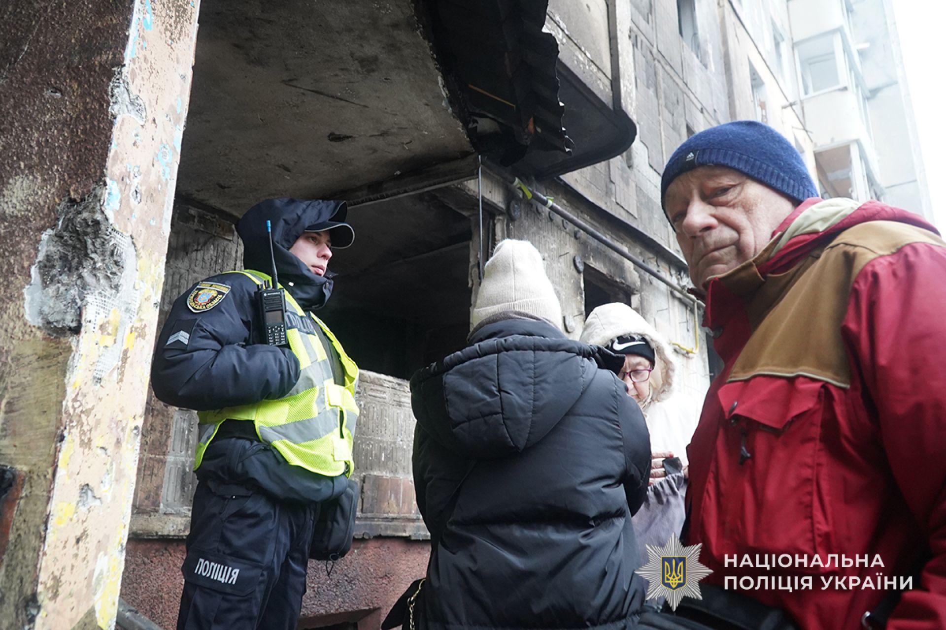 Поліцейські супроводжують мешканців зруйнованих будинків до їхніх квартир — лише на кілька хвилин і тільки в супроводі, щоб люди могли забрати найцінніше з того, що вдалося врятувати після удару.