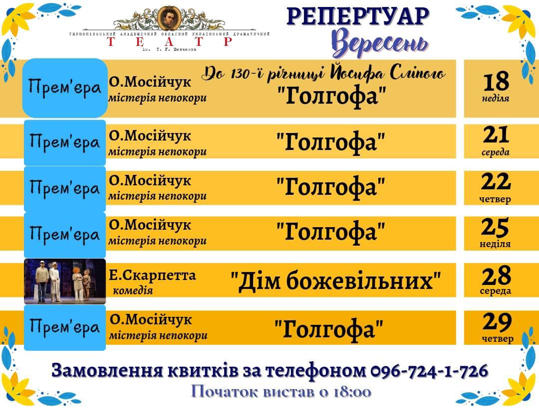 Репертуар Тернопільського драмтеатру на вересень. Замовлення квитків за тел. 096-724-1-726