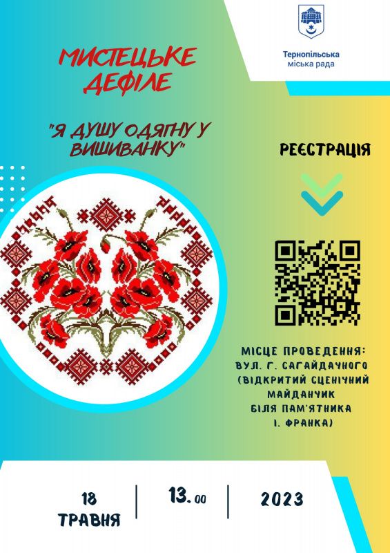 З нагоди відзначення Міжнародного дня вишиванки, який цьогоріч припадає 18 травня, у Тернополі відбудеться мистецьке дефіле «Я душу одягну у вишиванку». Початок заходу о 13:00 год.