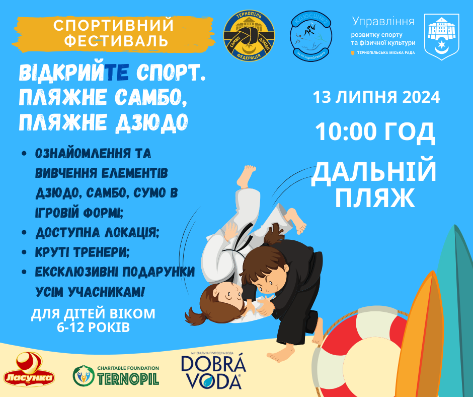 13 липня на відпочинковій зоні «Дальній пляж» відбудеться спортивний фестиваль «ВідкрийТЕ спорт. ПЛЯЖНЕ САМБО, ПЛЯЖНЕ ДЗЮДО».