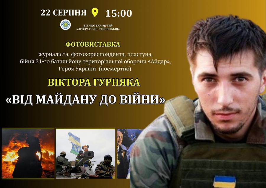22 серпня о 15:00 в Тернопільській бібліотеці-музеї «Літературне Тернопілля» відбудеться відкриття фотовиставки відомого журналіста, фотомитця, пластуна, бійця 24-го батальйону територіальної оборони «Айдар», Героя України ( посмертно) Віктора Гурняка «Від Майдану до війни».