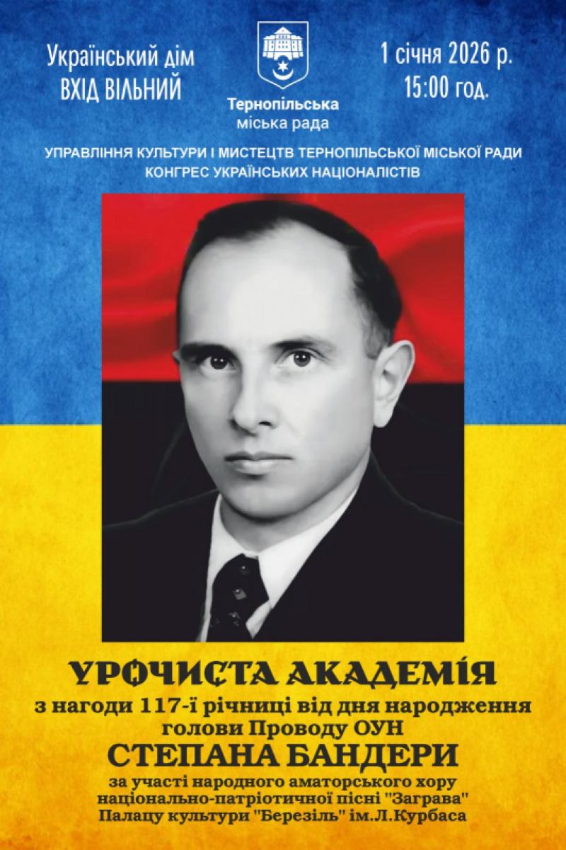 Урочиста академія до 117-ї річниці з дня народження Степана Бандери відбудеться у Тернополі 1 січня 2026 року.