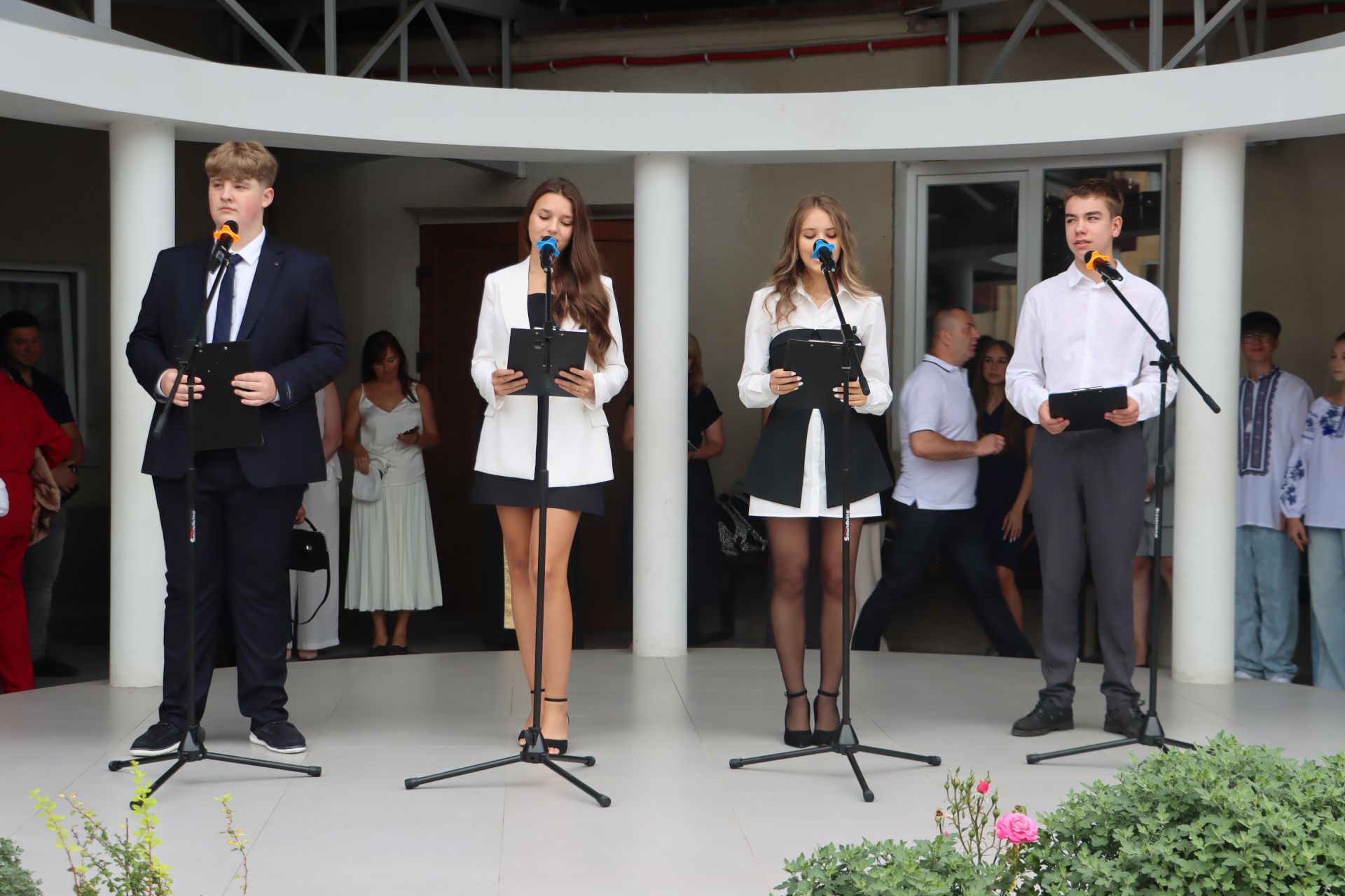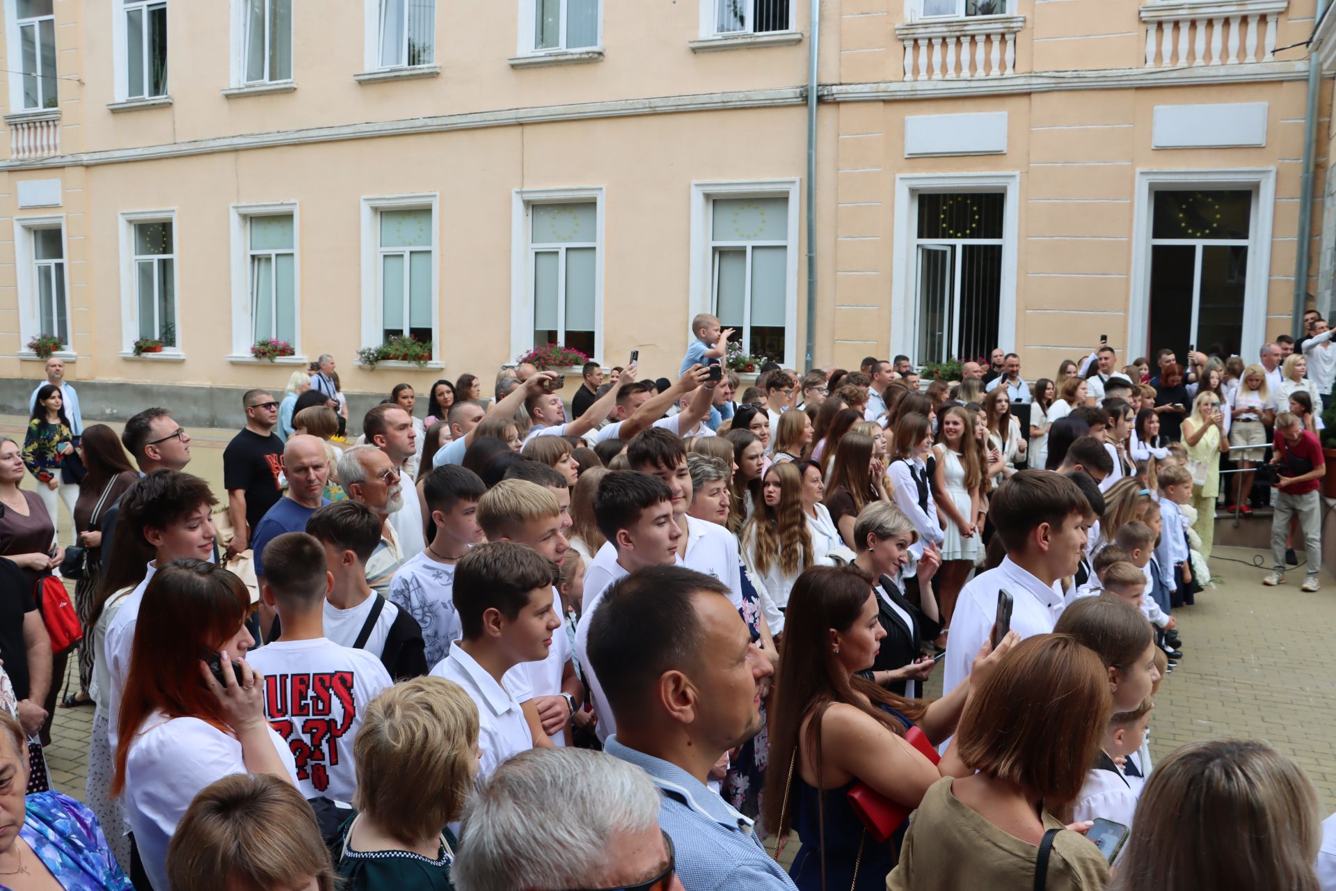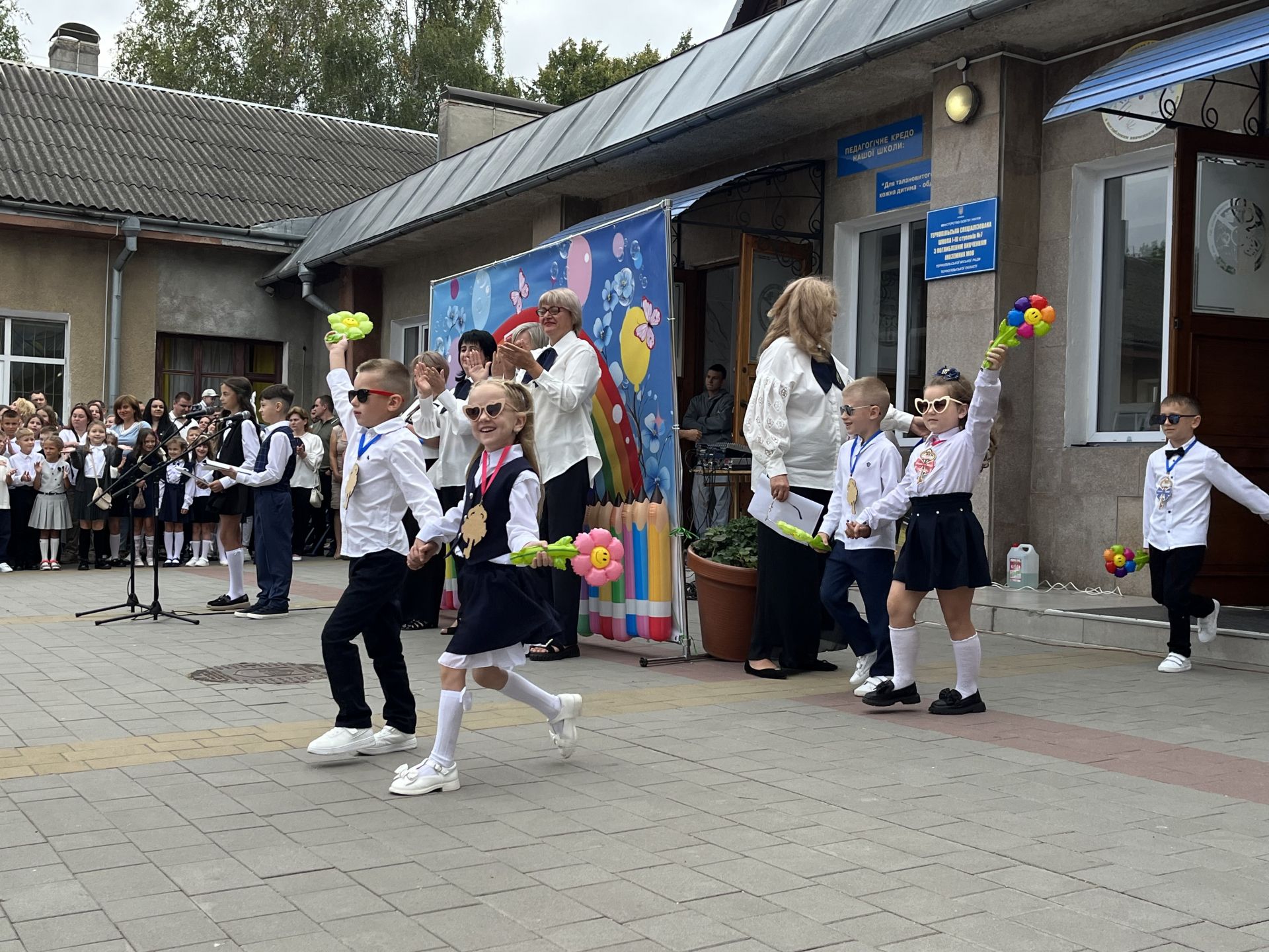 Урочистості розпочалися з пісні, яку виконали вчителі для рідної школи та її учнів, а вже потім зустрічали 11-класників і першачків. Цьогоріч шкільна родина поповнилася понад 70 першокласниками. Їхній вихід був яскравим — у сонцезахисних окулярах та з кульками.