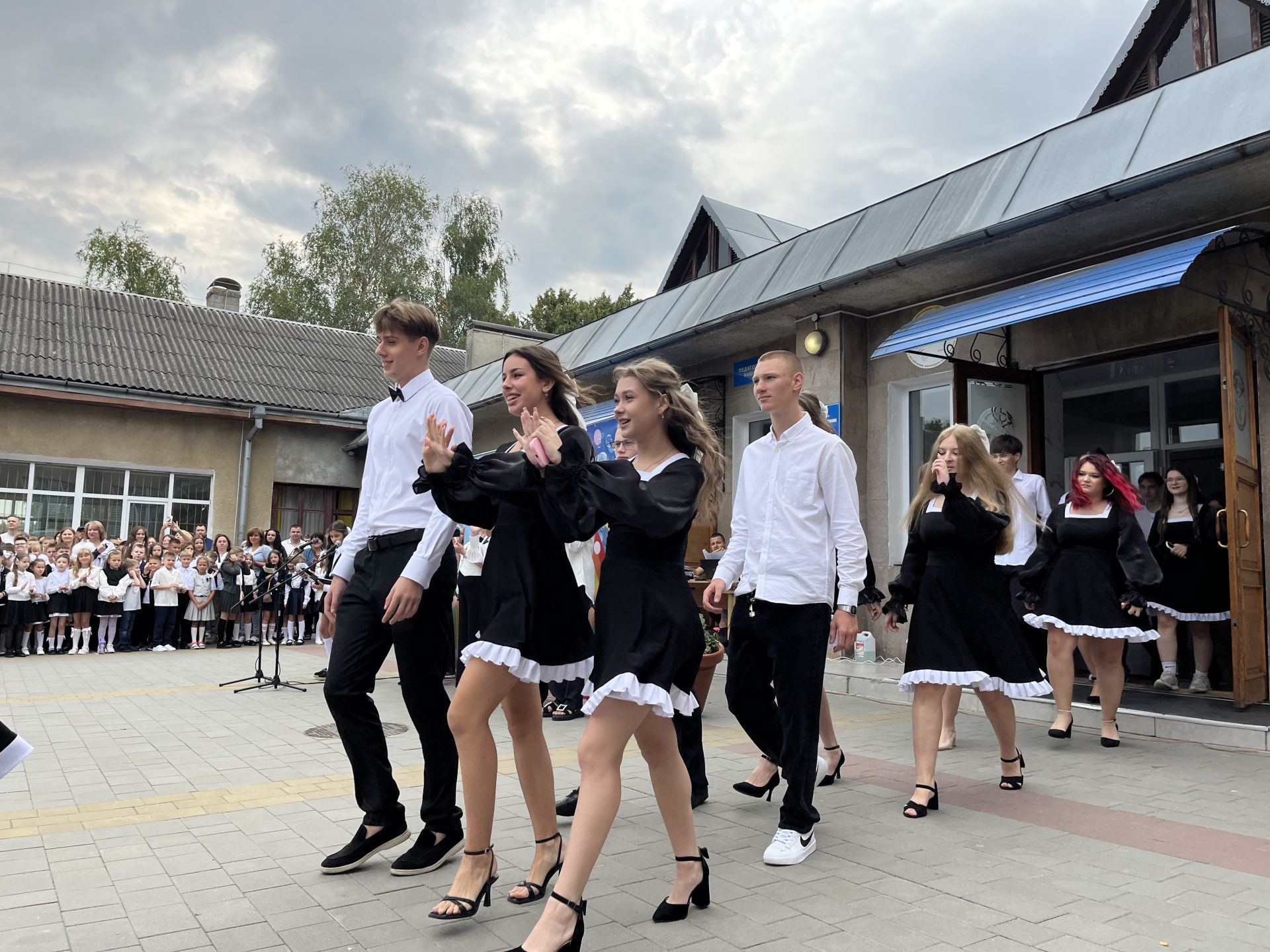 11-класники обрали для себе тематичний одяг: дівчата були в однакових синіх сукнях, а хлопці — у класиці: білі сорочки та чорні штани. Разом із першокласниками виконали танець «Вірте, люди, у дива».